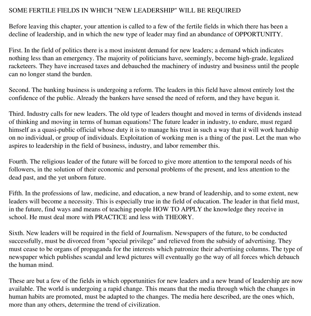 This writer suggests 6 fertile fields in which “New Leadership” will be required. In a nutshell, politics, banking, industry, religion, education, and media will need new leaders to drive innovation. Make sense?