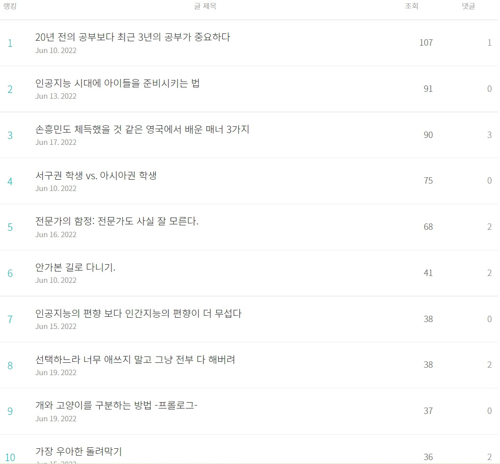 내가 쓴 글들 중 어떤 글들에 대한 조회수가 많았나보니, '공부'에 대한 관심이 많다. '교육'은 한국인들의 지대한 관심사임에 틀림없다.