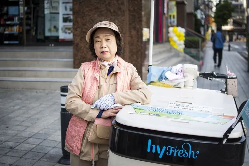 A "yogurt ajumma," who delivers stands next to her motorized mobile rrefrigerator. Eli Imadali/City