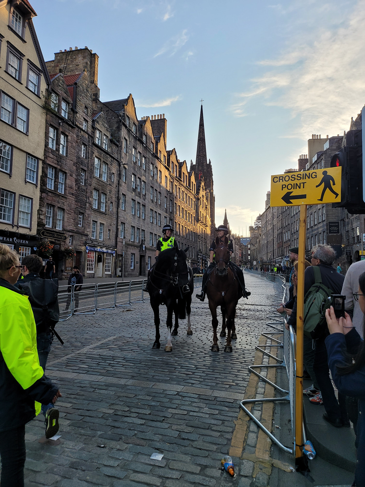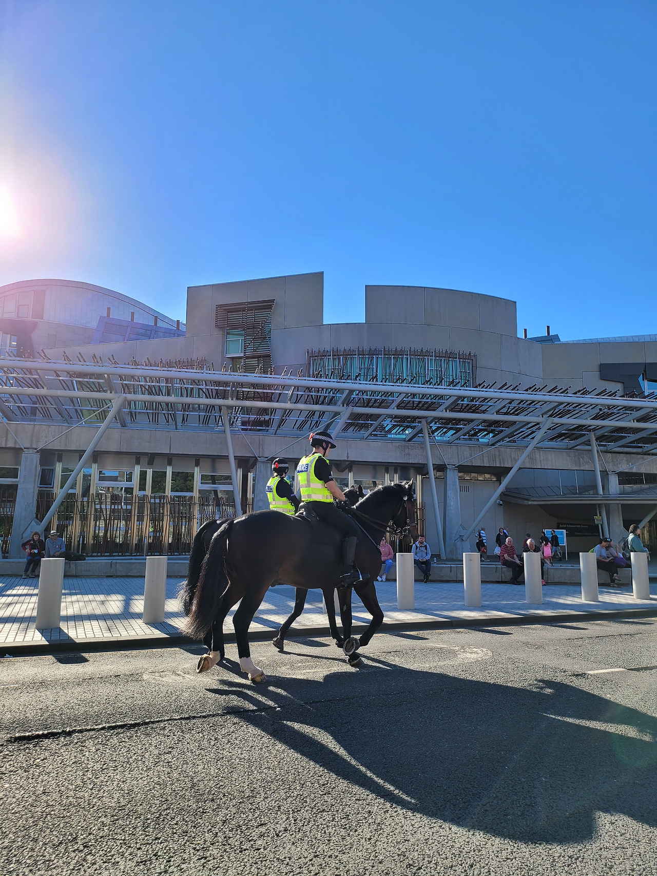 스코틀랜드 국회의사당 주변도 경계가 강화되었다. 말을 타고 순찰을 하는 것이 효율적인 것 같지 않은데 어쨌든 영국을 상징하는 모습 중의 하나이고, 멋있기는 하다. 중요한 이벤트가 있을 때는 꼭 등장한다.(이 말을 탄 경찰들이 등장할 때는 길거리에 이 말들의 배설물도 잘 피해다녀야 한다.-.-)