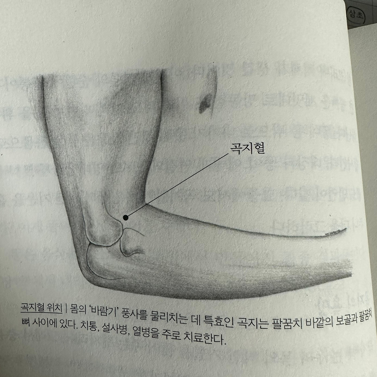 위치: 팔꿈치를 구부리면 두 뼈 사이에 가로로 생기는 줄의 바깥쪽에 움푹 파인 곳