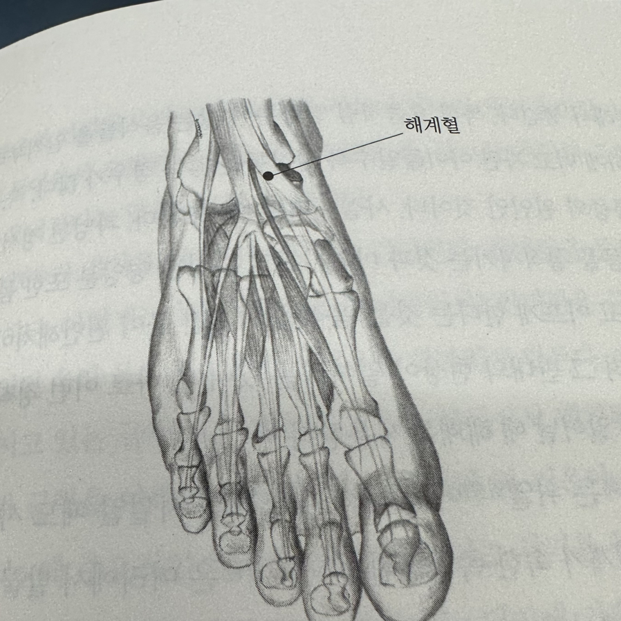 위치: 발등을 굽혔을 때 발목에 두 개의 딱딱한 힘줄 사이 푹 들어간 곳