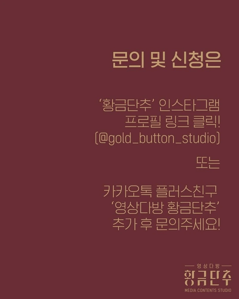 등록은 인스타그램 @gold_button_studio (프로필 하단 링크 클릭) 혹은 카카오톡 플러스친구(영상다방 황금단추)
