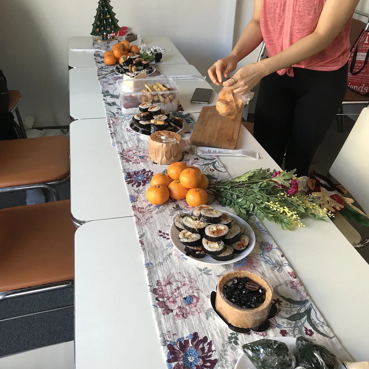 그 기억을 떠올리며, 크리스마스 파티를 하자고 대표에게 먼저 제안을 했다. “좋다! 뱅쇼는 내가 만들게!!”라며 화답해준 대표 덕에, 일은 순조롭게 진행됐다. 나는 평소 즐겨 먹는 우리 집 표 ‘두부 김밥’을 넉넉히 준비했고, 수련생들에겐 함께 먹을 간식 한 가지와 읽던 책 한권이 준비물이라고 미리 일러뒀다. 파티 당일, 먹고 떠들며 이들 한명 한명을 지켜보는데 참으로 고마웠다. 수업을 진행할 때부터 꾸준히 나와 함께 해준 이부터, 황금단추가 위치한 합정에서 꽤 멀리 떨어진 인천, 분당 등에서 주말마다 이곳에 꼬박꼬박 와준 이들에게. 그리고 무엇보다 요가 수련을 하고 함께 웃고, 떠드는 이 시간을 진심으로 즐기고 있는 모두에게.