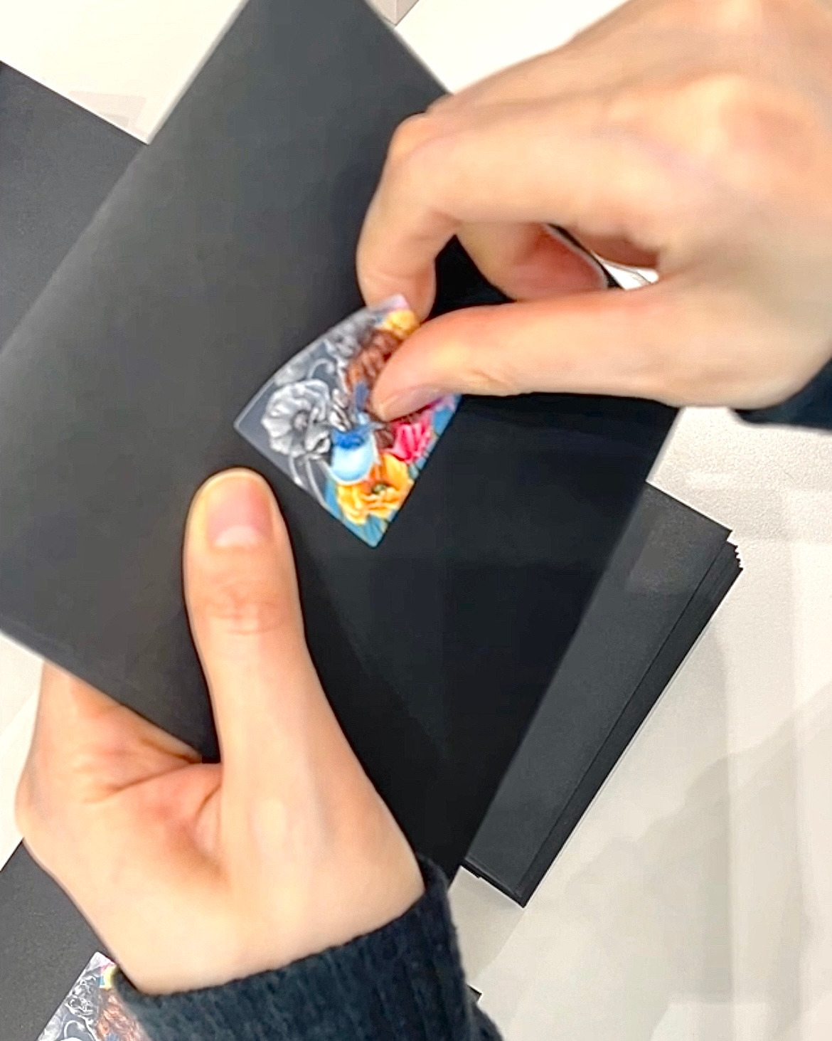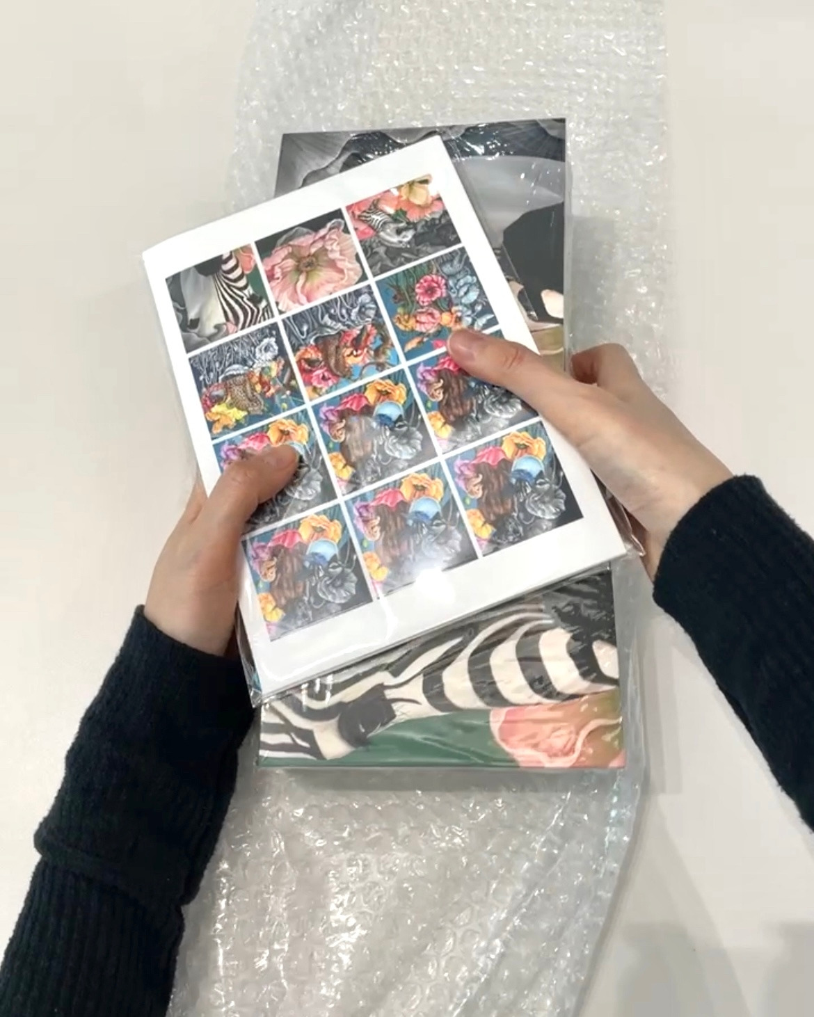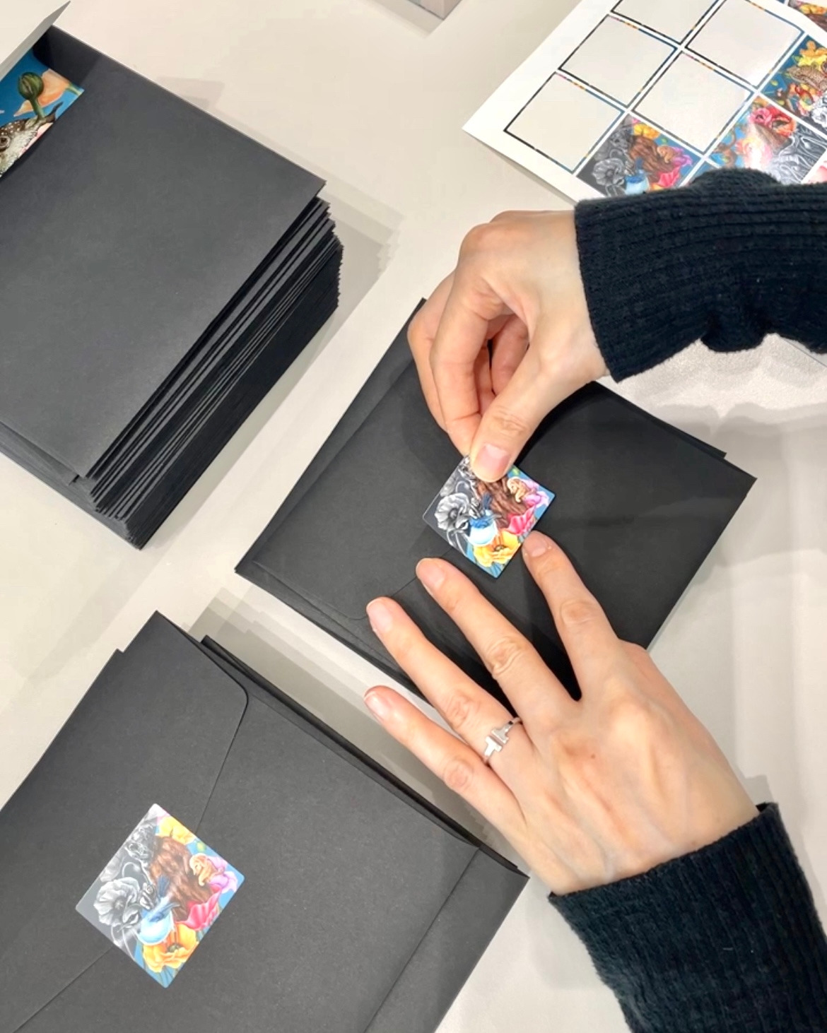 평소 자주 애용하던 인쇄 업체 사이트에 들어가서 사이즈를 지정하고 종이를 고른 후 웹하드에 파일을 업로드했다. 뒷면에는 간단한 작품 설명을 넣어서 프린트할 계획이었다. 정방형 그림이라 정사각형 형태의 엽서로 각 그림장 100장씩 총 700장을 주문했고, 사이즈에 맞는 봉투는 다른 업체에서 구입했다. 봉투는 블랙으로 선택했다.