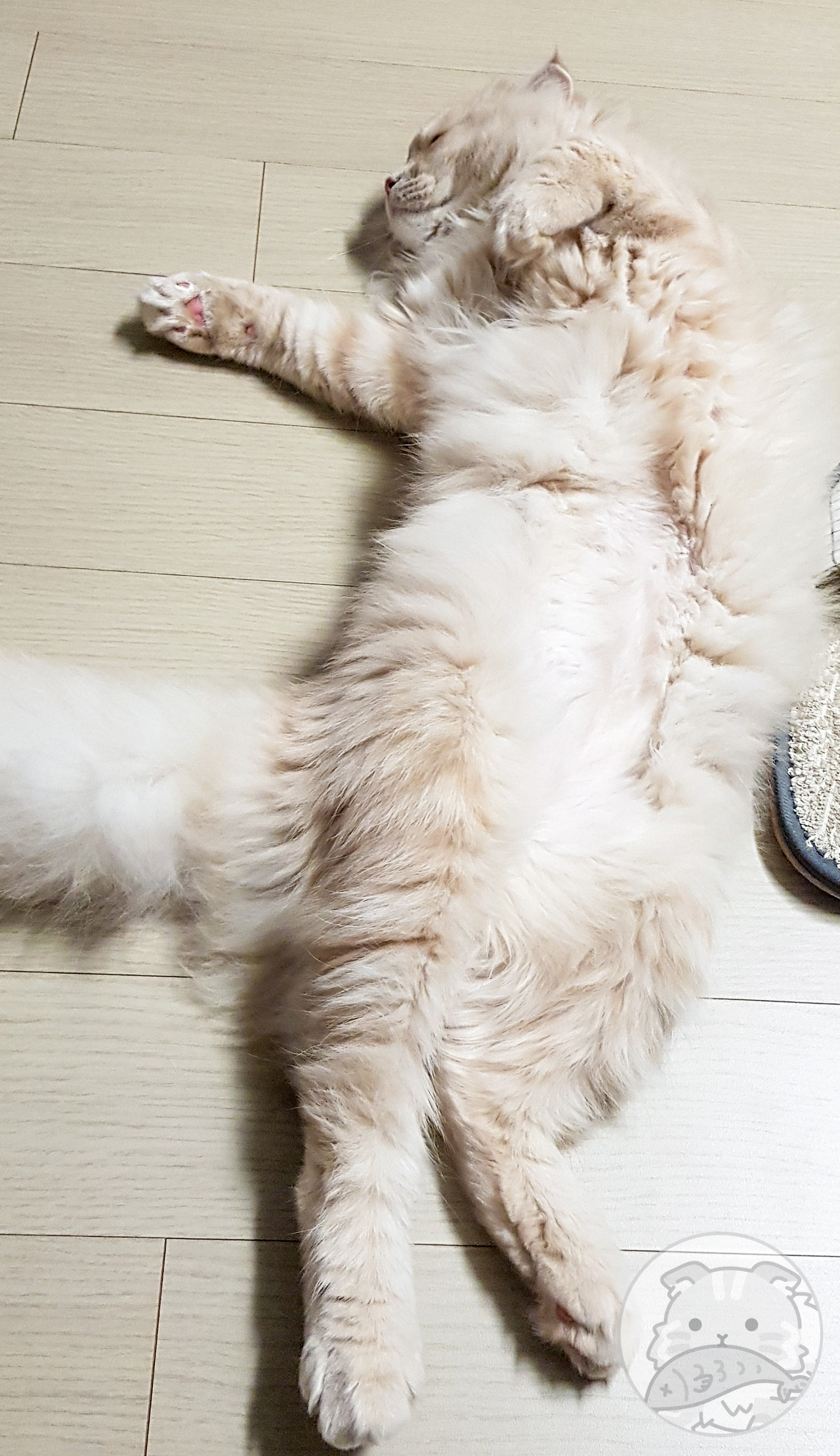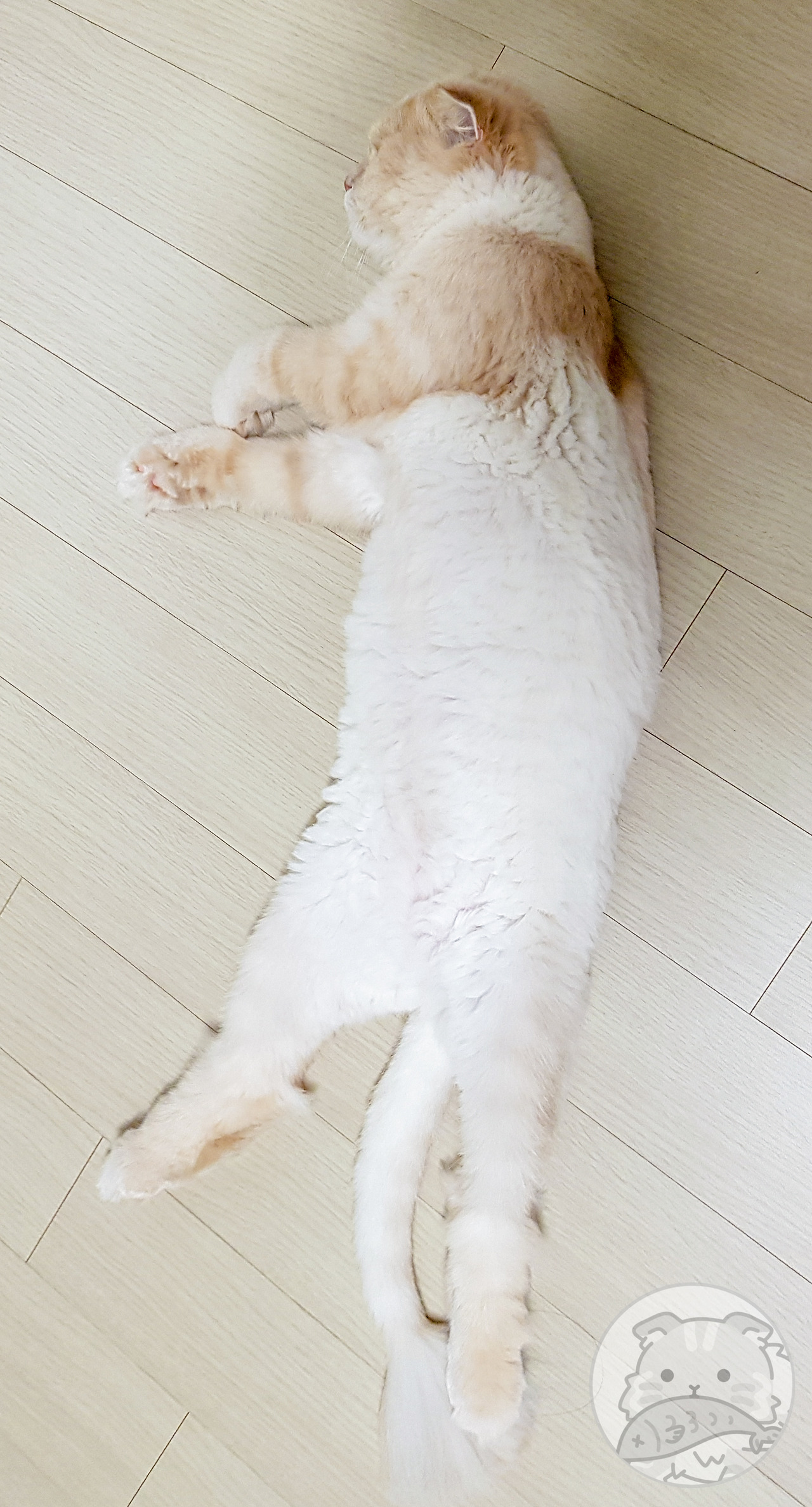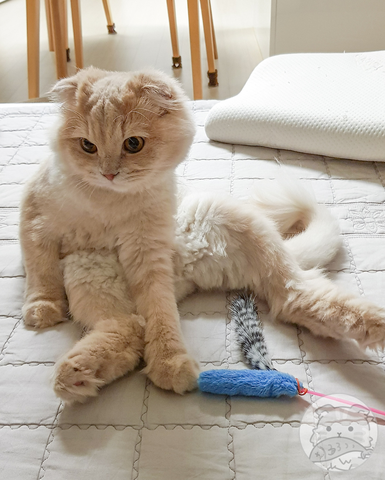 요미는 스코티시폴드다. 정확히는 스코티시폴드 하이랜드. 시조 중 페르시안 종이 있어 장모 유전자를 보유한 채 태어났다. 고양이는 장모보다 단모가 우성(優性)이다. 요미는 열성(劣性)인 장모 종이라 털이 자주 뭉친다. 그래서 털이 뭉치기 전에 빗질로 풀어줘야 한다.