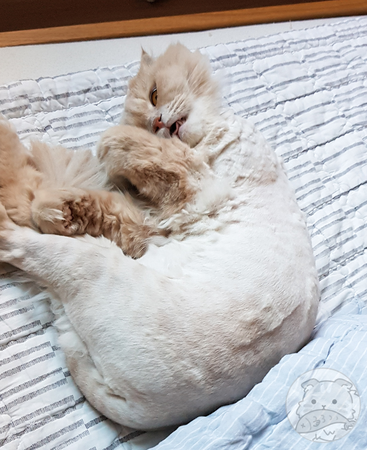 고양이 미용은 무마취 미용과 수면마취 미용이 있다. 수면마취 미용은 쉽고 빠르지만, 부작용 우려가 있고 고양이 몸에 무리를 준다. 낮은 확률이지만 기력을 회복하지 못하거나, 눈을 뜨지 못하는 경우도 있다. 그래서 대부분 무마취 미용을 하는데, 무마취라고 좋은 게 아니다. 무마취 미용은 고양이가 깨어있는 상태에서 외부인이 털을 다듬는다. 사람으로 비유하면, 거대한 외계인이 내게 알아듣지 못하는 소리로 겁박하고 발가벗긴 채 털을 미는 꼴이다. 정신적 스트레스가 클 수밖에 없다. 수의사들도 미용을 꼭 해야 한다면 무마취 미용보다 마취 미용을 권장했다. 하지만 고양이 미용은 하지 않는 게 가장 좋다. 이 사실을 이제야 깨달았다. 요미 보기가 부끄럽다.