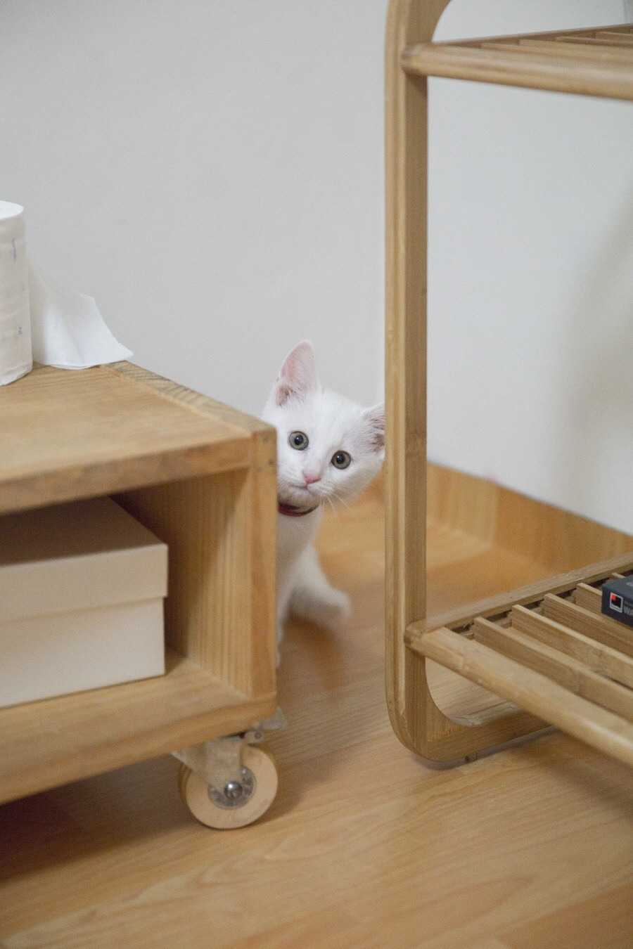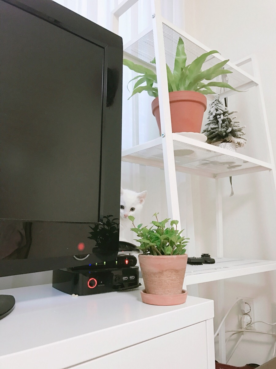 이튿날 출근 준비를 하는데, 내가 잘 땐 맘 편히 돌아다니고 쉬더니 내가 눈뜨고 돌아다니니 곧장 경계태세다. 아직 나를 이방인으로 생각하고 있나 보다. 티비 뒤에 숨어 안 쳐다보는 것도 아니고 나를 훔쳐보고 있다.