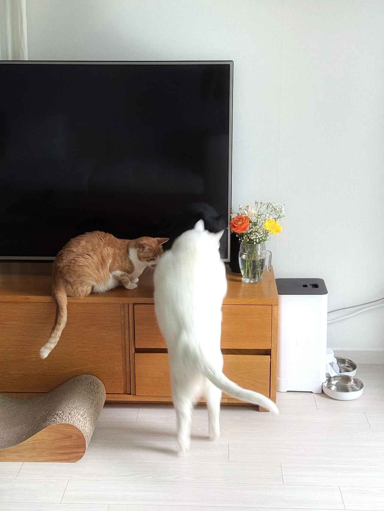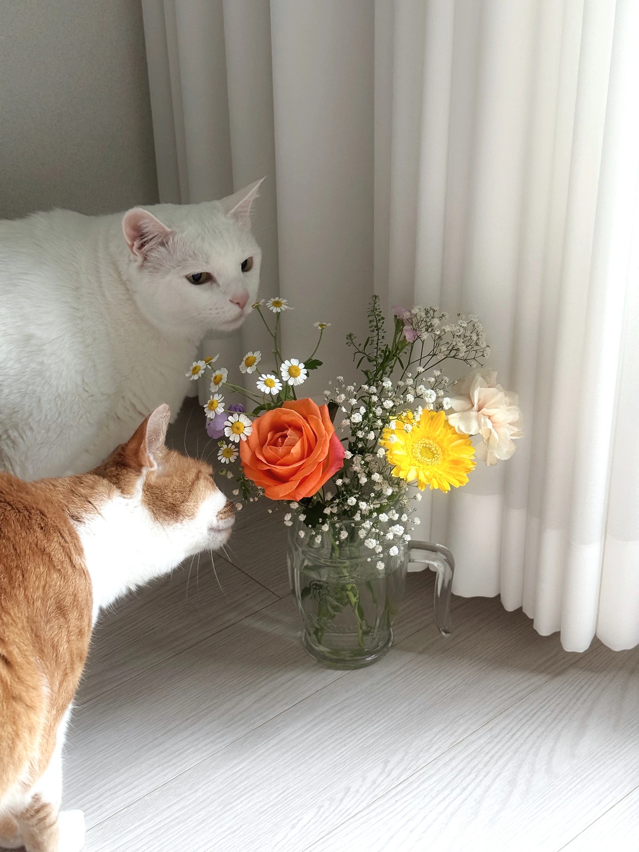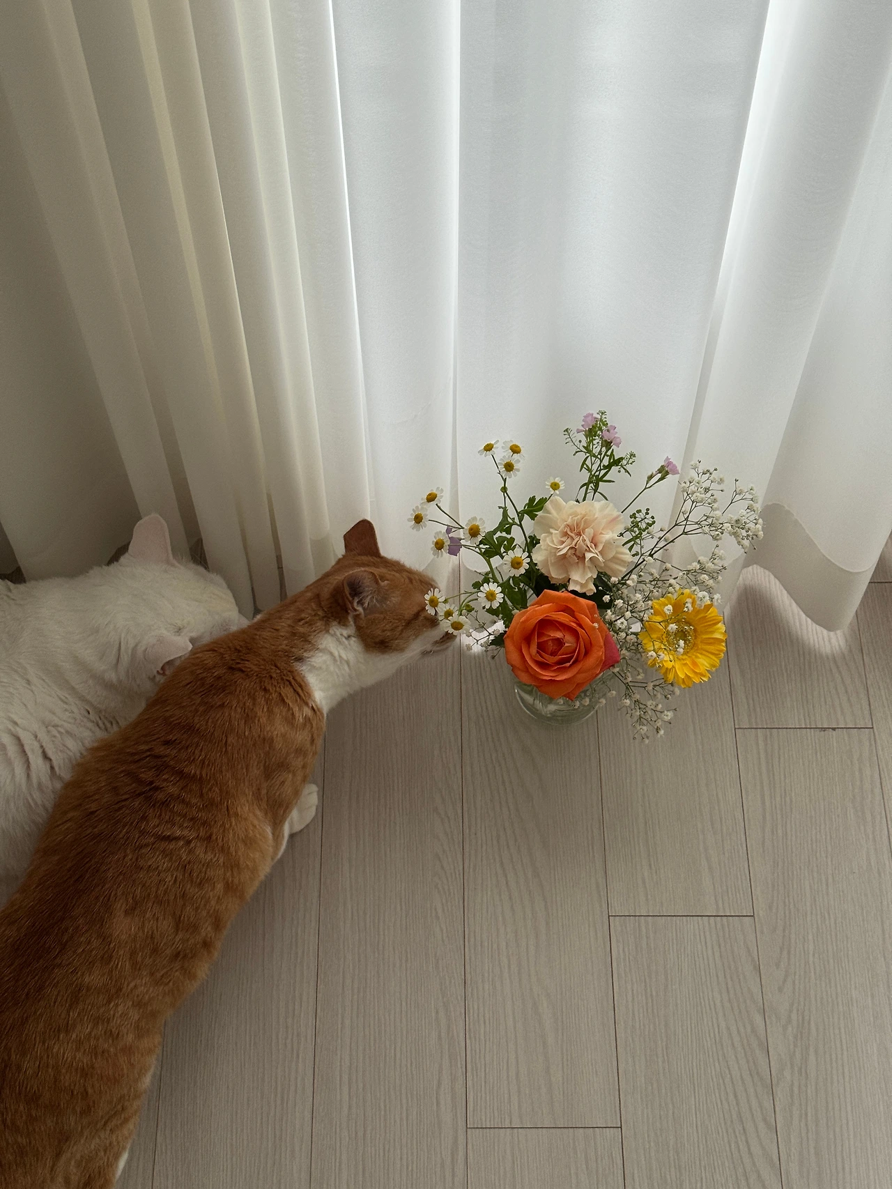 결혼기념일에 받은 꽃다발 덕분에 별이와 달이가 낮잠을 뒤로 하고 분주하다.
