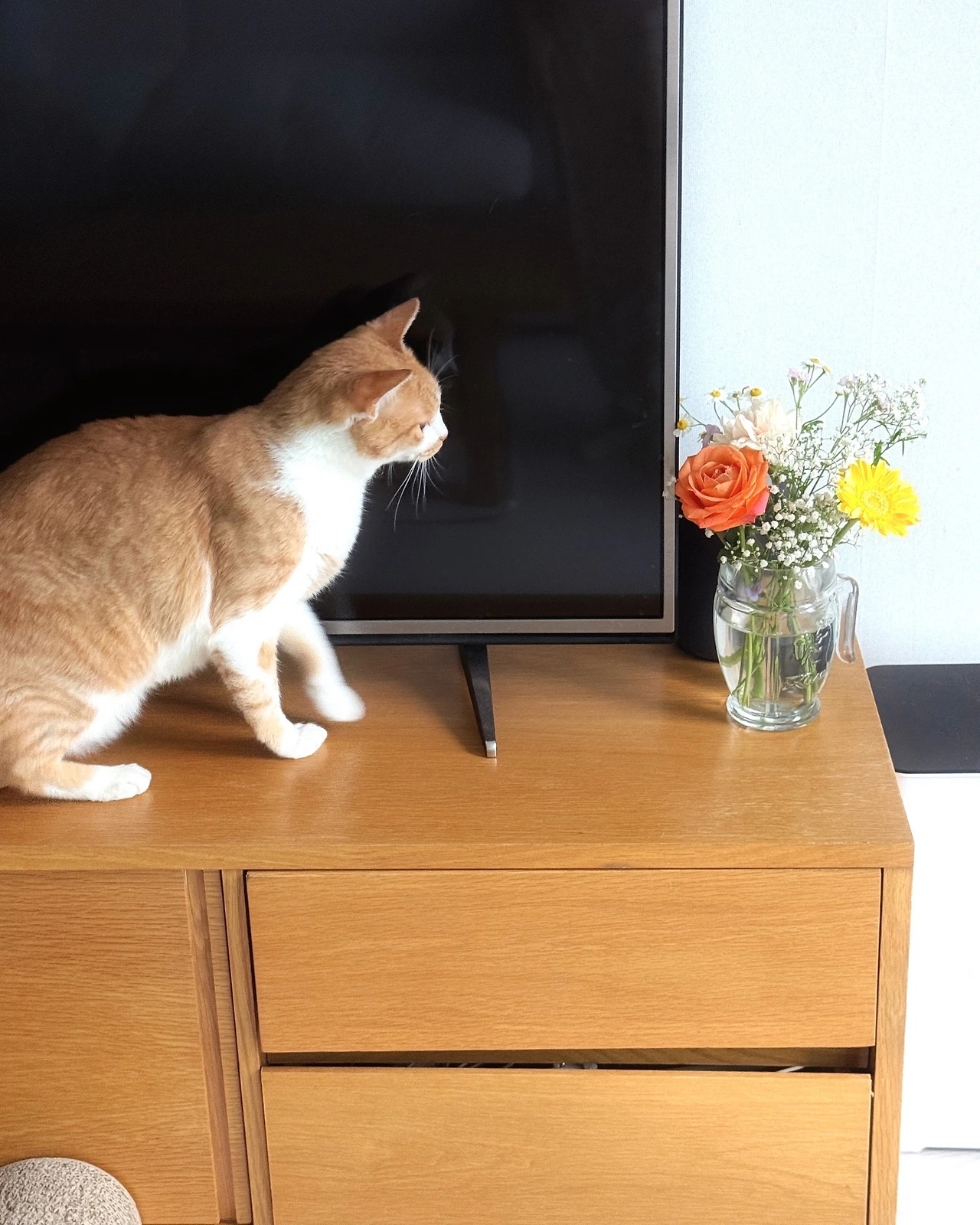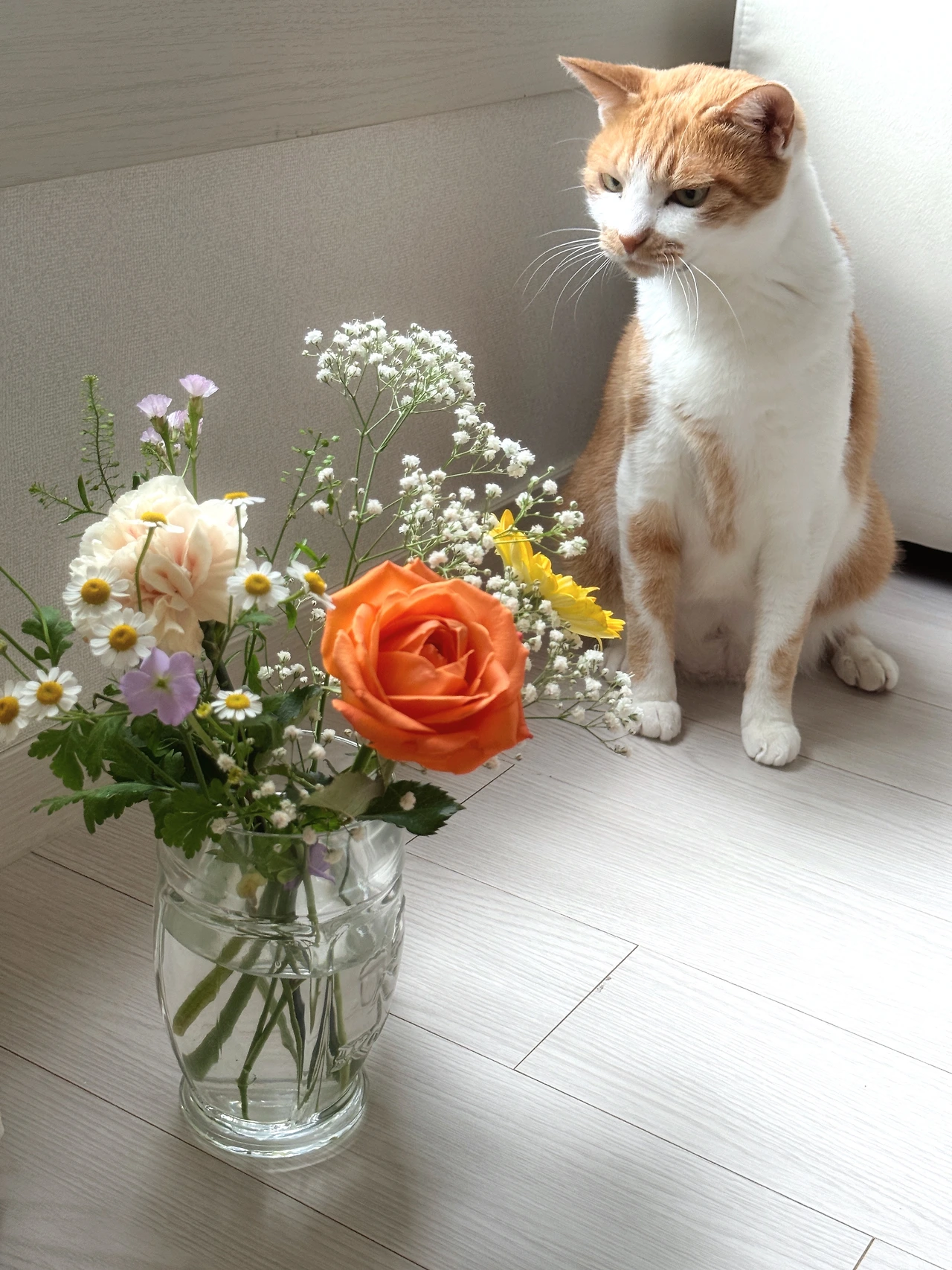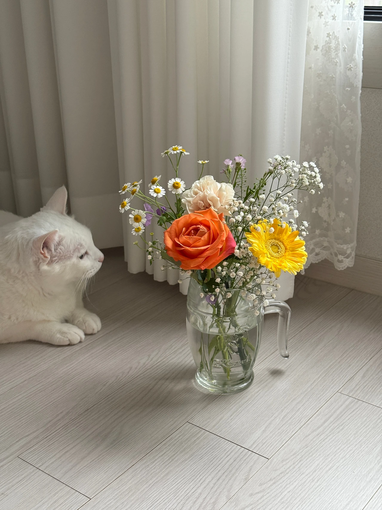결혼기념일에 받은 꽃다발 덕분에 별이와 달이가 낮잠을 뒤로 하고 분주하다.