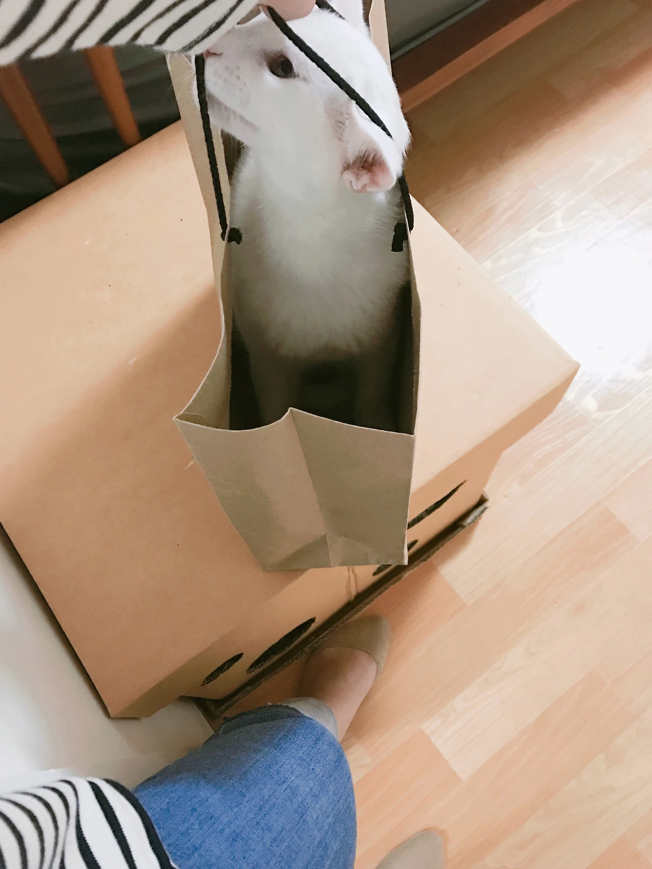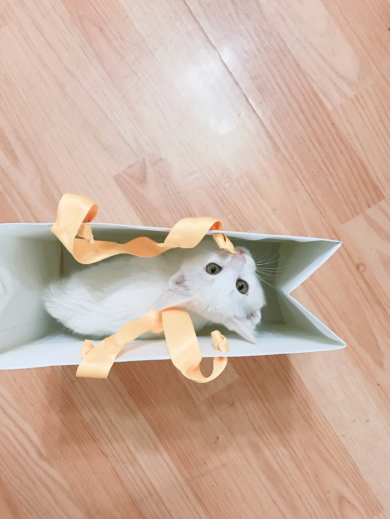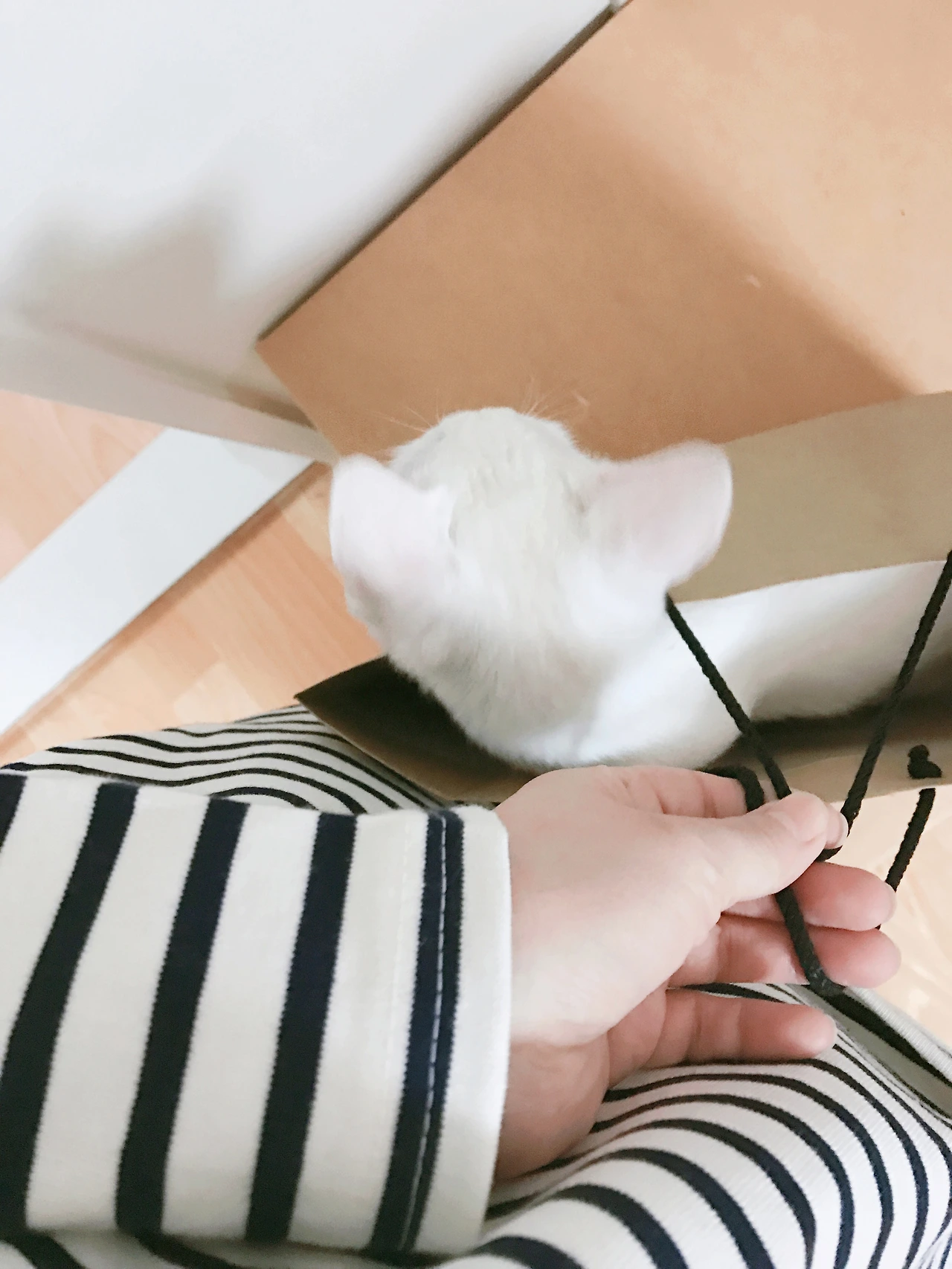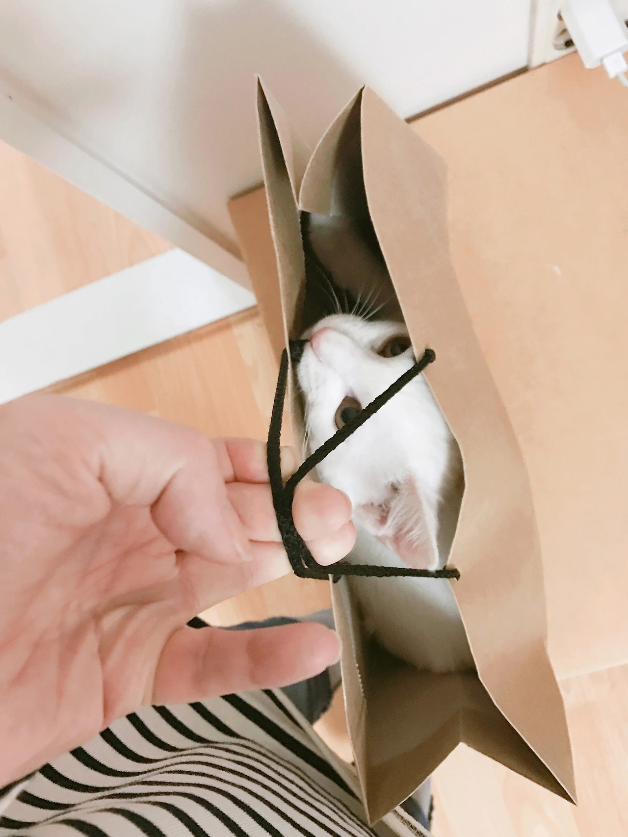 우연히 종이쇼핑백을 바닥에 두고 청소를 하던 어느날, 별이가 보이지 않아 찾던 와중 알았다. 저 안에 들어간 별이는 나오라 재촉하는 나와 실갱이를 벌일만큼 장난을 치며 안간힘을 쓰고 나오지 않겠다 버텼다. 그 녀석에겐 그게 놀이이고 재미난 공간이었던 것이다.