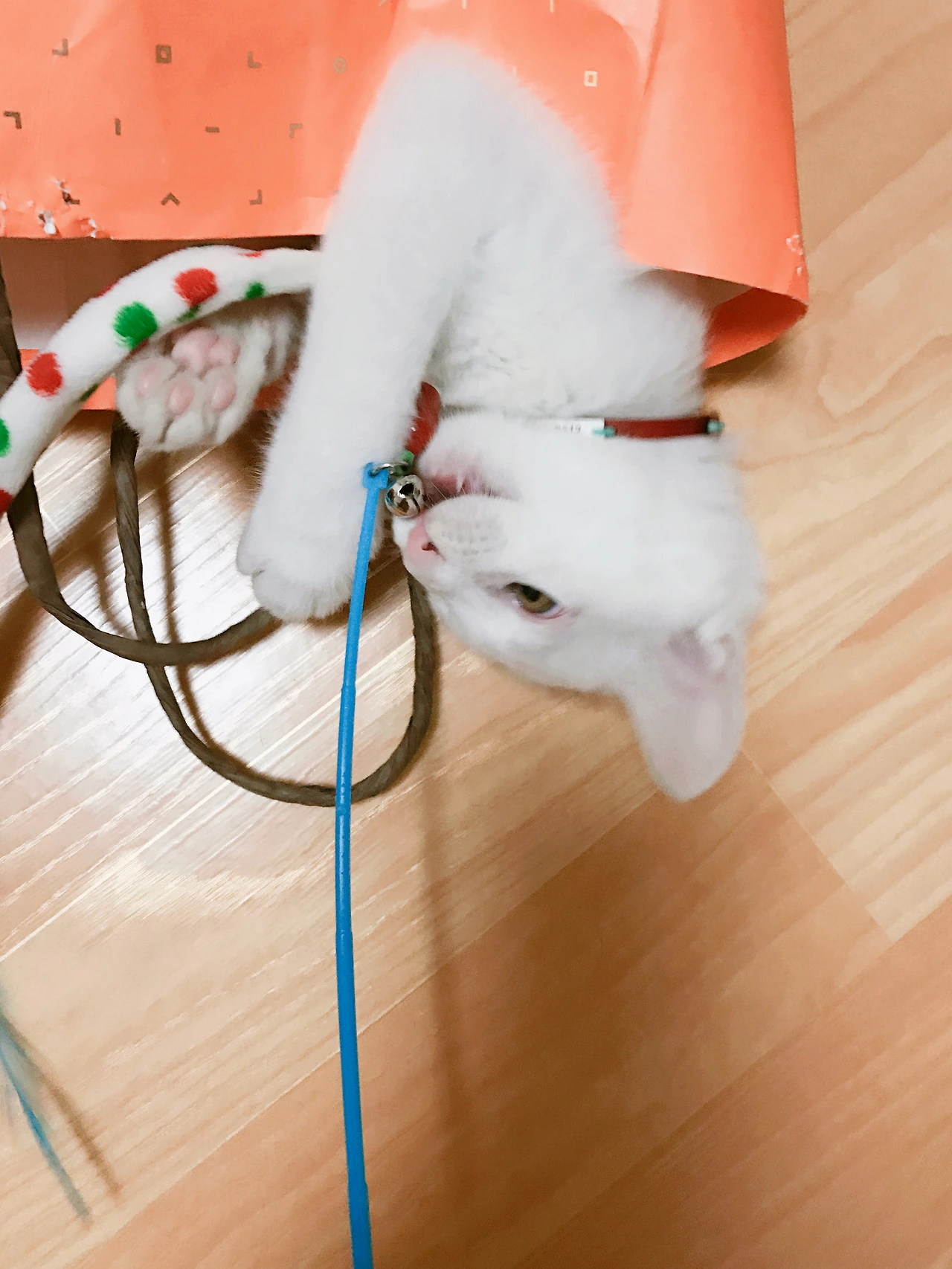쇼핑백이 오면 자연스럽게 뛰어들어간다. 그럼 집사는 또 열심히 들어 외쳐야 한다. "별이 사세요~ " "밝고 명랑한 고양이 여기있어요~" 들어서 강하지 않게 흔들어줘야한다. 아무생각없이 한번 해줬던 놀이가 또 다시 별이에겐 필.수.코.스 란게 되어버린 것이다.