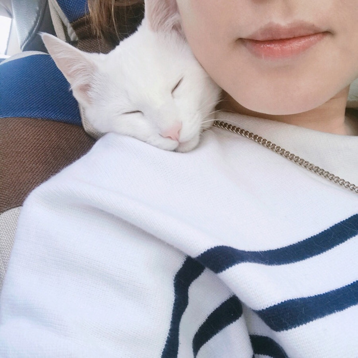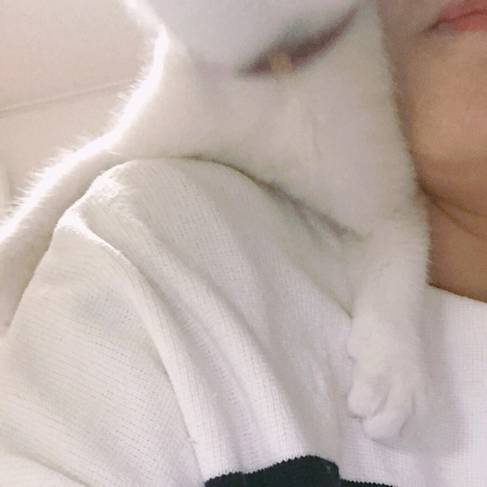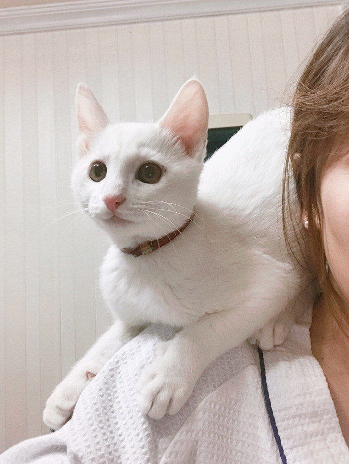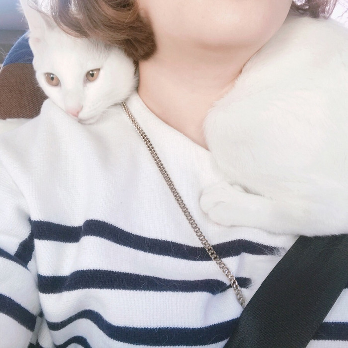별이가 오고 한동안 병원을 꾸준히 다니며, 동네 가까운 병원도 있었지만 나름 선생님들 친절하고 좋으시며 함부로 부담스러운 진료를 권하지 않는 병원을 다니게 됐다. 택시를 타고 15분여를 가야 하는 곳이라 외출할 때마다 택시를 탔는데 별이가 너무 무서워하길래 서너 번째부터 이동장 문을 열어줬더니 그곳에서도 별이는 이렇게 내 목 뒤에 체온을 나누고 안정을 취했다.
