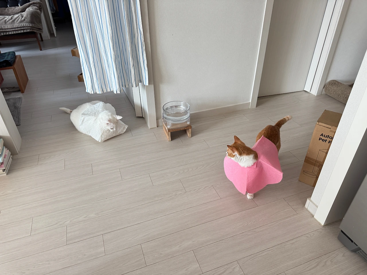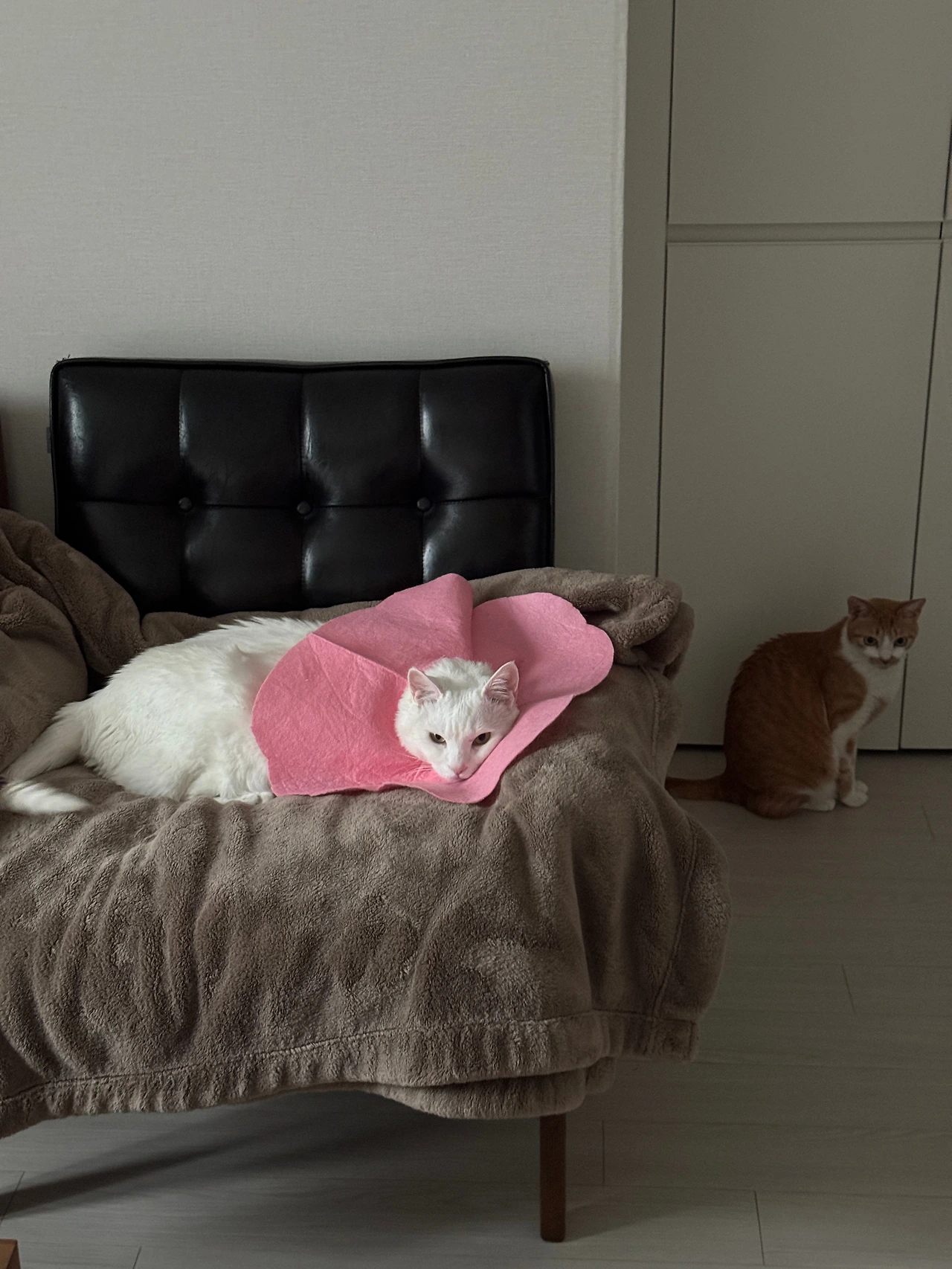 그래서 둘이 사이좋게 넥카라를 걸어주고 (이 마저도 갑갑함을 견디지 못하는 두 냥이에겐 부직포행주가 최고의 넥카라) 나는 1주일 동안 업무를 재택근무로 대체했다.