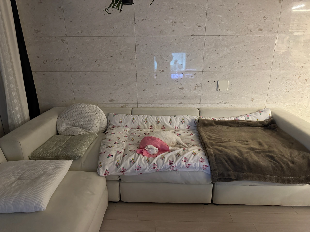 집에 올 때에도 병원에서 변 실수를 하고, 집에 와서도 싱크대 밑으로 들어가 한참을 안 나오다 소변실수를 하고 약 8시간이 지나서야 별이는 거실 소파에 누워 잠을 청했다.