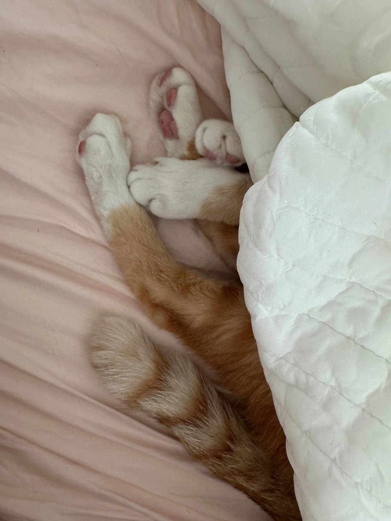이불을 덮고 자던 달이가, 발가락을 내밀고 있다.