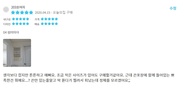 택배지옥에서 행복한 비명을 지르던 중 주문한 물건을 설치하다가 구성품에 포함되지 않은 압정에 찔려 손가락에 피가 좀 났었는데 압정의 용도를 물으며 구매후기를 남겼다. 그리고 이틀 뒤 고객센터에서 전화가 왔다.