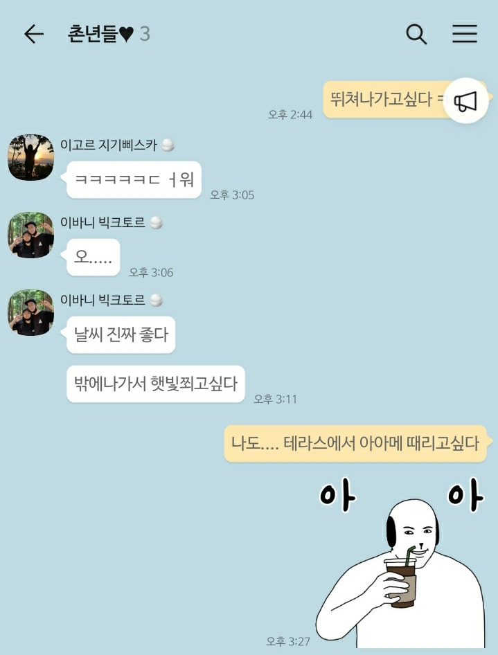 지난 주말은 오랜만에 비가 오지 않고, 하늘까지 푸르른 실로 오랜만에 좋은 날씨였다. 일주일 내내 집에만 있다 보니 날짜 개념도 없어지고, 더 이상 책을 읽고 싶지도 않고, 글이 써지지도 않았고, 스마트폰을 들여다보는 일도 소원해졌다. 우울했다. 이런 게 코로나 블루인건가? 단톡방에서 놀러 가고 싶다, 카페에 가고 싶다는 이야기를 하다 충동적으로 동네 카페로 뛰어갔다. 걸어서 5-6분 정도 거리에 사는 친한 친구(이바니 빅크토르=입이 크다고해서 붙인 별명. a.k.a 빅톨, 빅토르)네 부부와 함께 테라스에서 커피를 마시며 햇빛을 쬐는데 뒷목이 뜨거워 땀이 송골송골 맺히는 것도 너무 행복했다. 이렇게나 작고 소소한 것에 행복을 느끼네. 물론 커피를 마실 때를 제외하고는 마스크는 착용했지만..