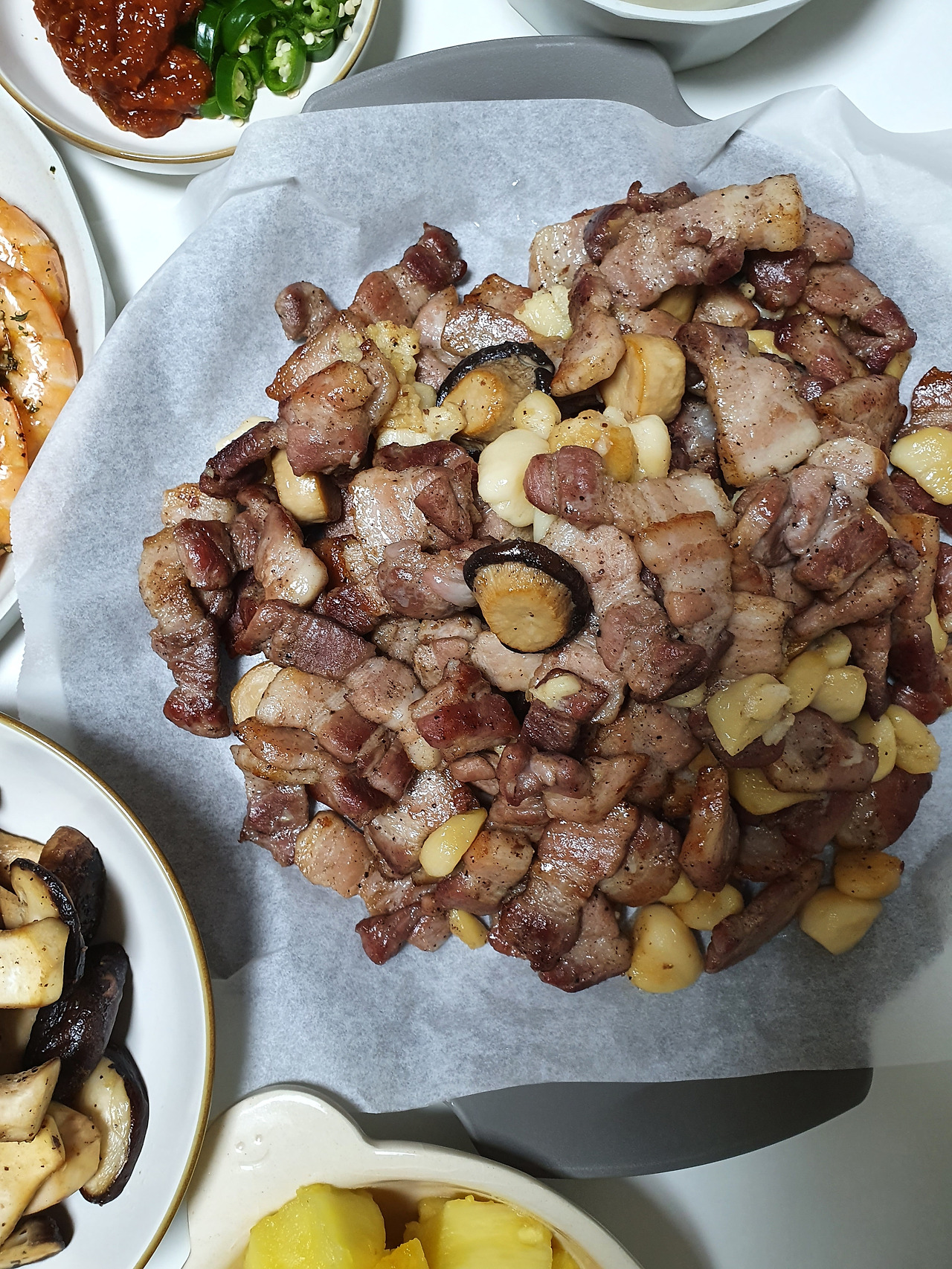 삼겹살은 버섯, 통마늘과 함께 통돌이에 돌린다. 고기가 익는데 시간이 더 걸리니 고기를 먼저 넣고 붉은기가 사라지면 채소를 넣는다. 좀 더 아삭한 채소를 먹고 싶다면 고기가 어느 정도 익었을 때 넣어야 한다. 특히 마늘은 일찍 넣으면.. 닭백숙에 있는 친구처럼 흐물거리게 된다.