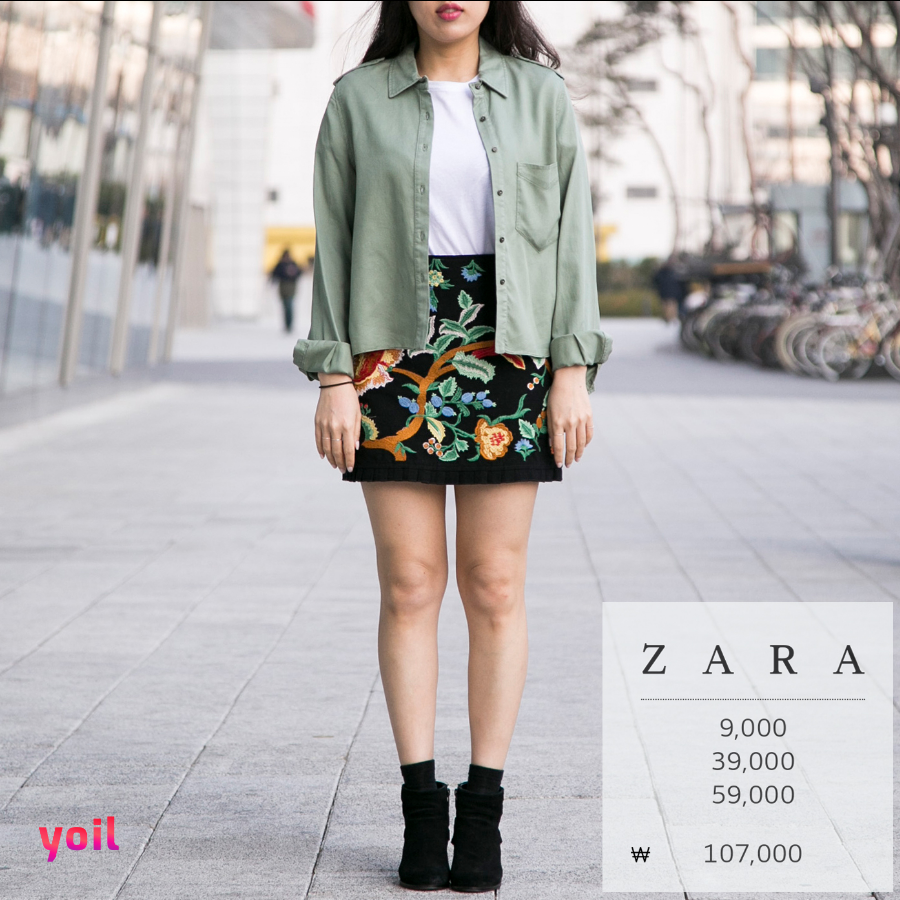 #ZARA #카키색셔츠 #흰티 #자수스커트