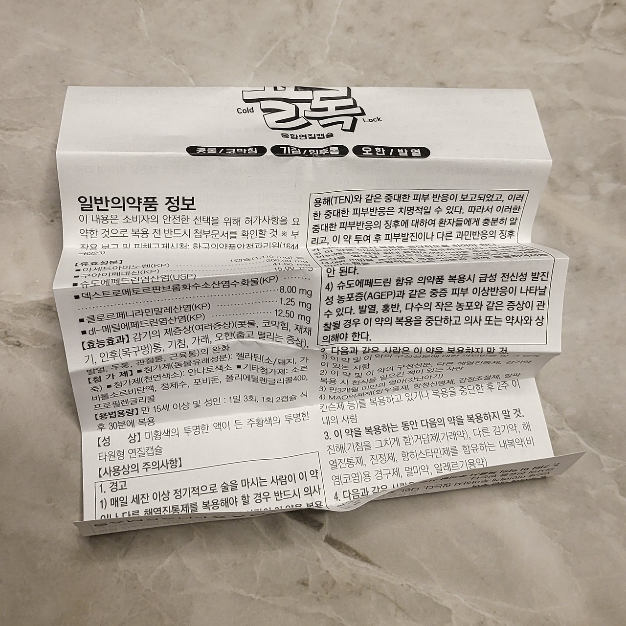 아래 사진은 집에 있는 종합감기약의 첨부문서를 찍은 것이다. 앞서 이야기했듯이 약의 성분과 효능효과, 용법용량 그리고 사용상의 주의사항이 적혀있는 것을 볼 수 있다.
