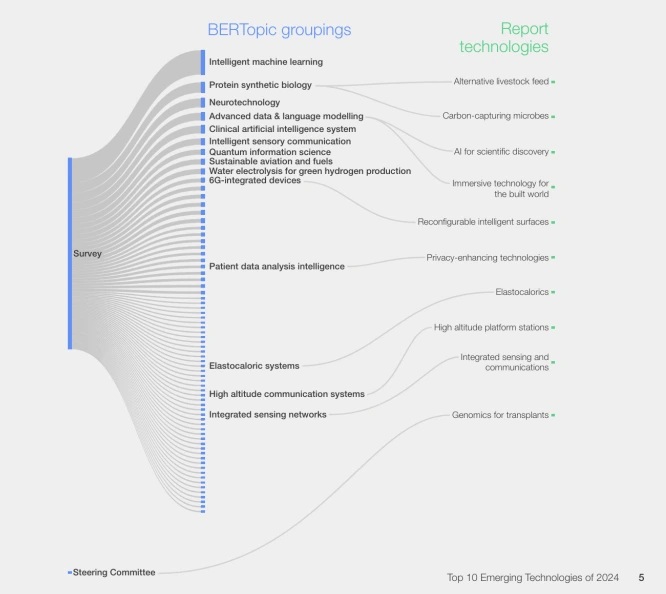 미래에 대한 인사이트를 가지기란 굉장히 어렵다. 그래서 도움이 될 만한 자료들을 찾아보았다. 세계 경제포럼(World Economic Forum, WEF)에서는 올해로 12회째 앞으로 3-5년 내에 사회와 경제적으로 큰 영향을 미칠 것으로 보이는 기술들을 선별해서 발표하고 있다. 2024년에도 하계 다보스 포럼을 통해 2024년에 주목할 만한 10대 신기술을 발표했는데, 아래와 같다.