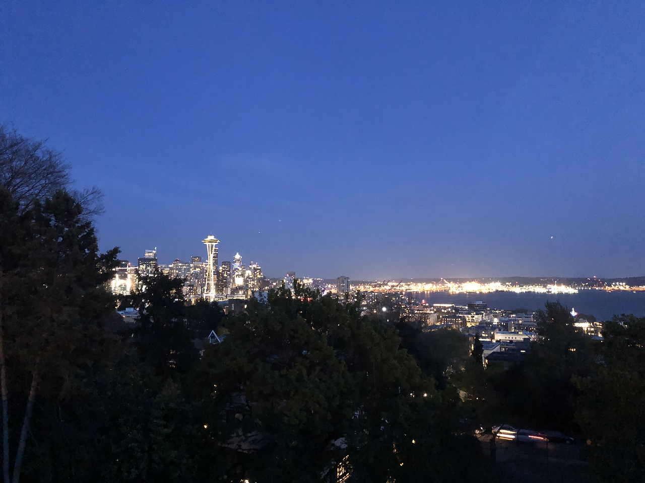 밝았던 하늘은 시간이 지남에 따라 차츰 어두워졌고 노을이 지기 시작했다. 시애틀에서 맞이한 노을은 영화 ’시애틀의 잠 못 이루는 밤’과 같이 옛사랑의 추억을 회상하게 되는 그런 쓸쓸한 느낌이었다. 또한 비가 자주 오는 시애틀의 촉촉함을 그대로 느낄 수 있는 노을이었다. 서서히 지고 있는 해를 등지고 돌아서면 시애틀의 시티뷰와 함께 시애틀의 랜드마크 스페이스 니들을 볼 수 있다. 순식간에 밝았던 하늘이 점점 깜깜해지고 하나 둘 건물의 불빛이 밝아왔다. 화려한 불빛들로 인해 생동감이 느껴졌던 뉴욕과 달리 시애틀의 밤은 노을을 바라봤을 때 받았던 느낌의 연장선과 같이 쓸쓸함이 가득했다. 그리고 그리움이 사무쳤다. 한국에 있는 어느 누군가에 대한 그리움. 그렇게 나의 조금 특별한 보통날의 하루가 끝나가고 있었다.