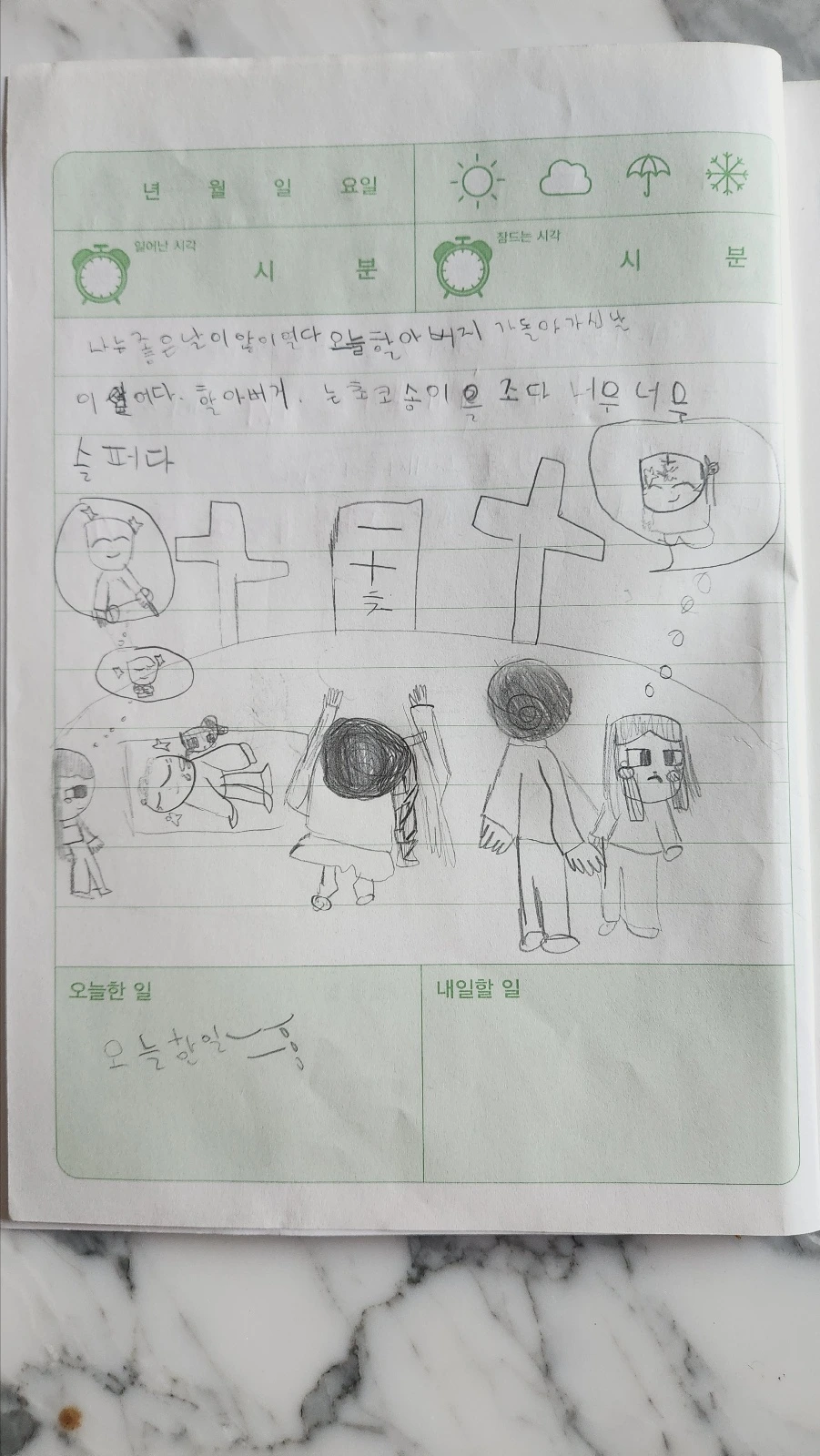 좋은 날이 아니었다. 오늘 할아버지가 돌아가신 날이어서 다. 할아버지는 초코송이를 줬다. 너무너무 슬퍼다.