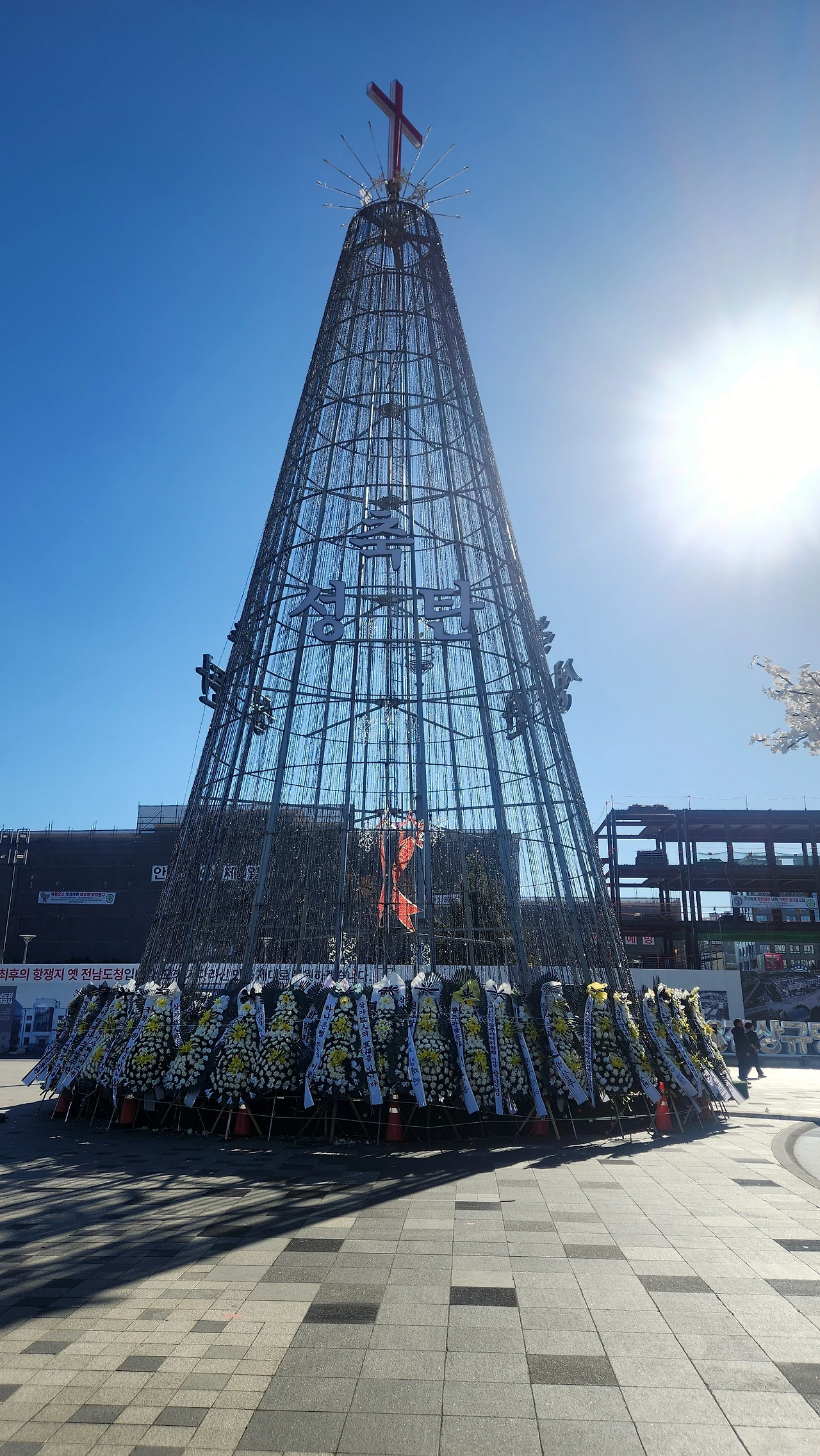 며칠 전까지만 해도 '축 성탄' 작은 전구들이 빛을 발했을 트리 조형물에, 근조 화환들이 둘러싸고 있었다.