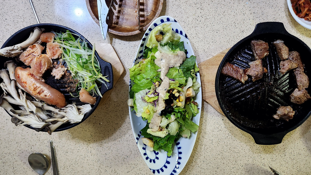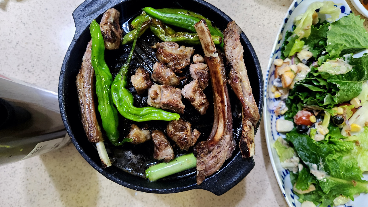 프라이팬과 에어프라이기에서 파향과 버터, 마늘향을 입고 노릇해진 양갈비는 식탁 위 1인용 무쇠 그릴로 옮겨졌다. 이 집 집밥천국 사장님은 어찌 된 일인지 앞치마를 두르기만 하면, 갑자기 요리와 세팅 열정이 샘솟는 듯하다.
