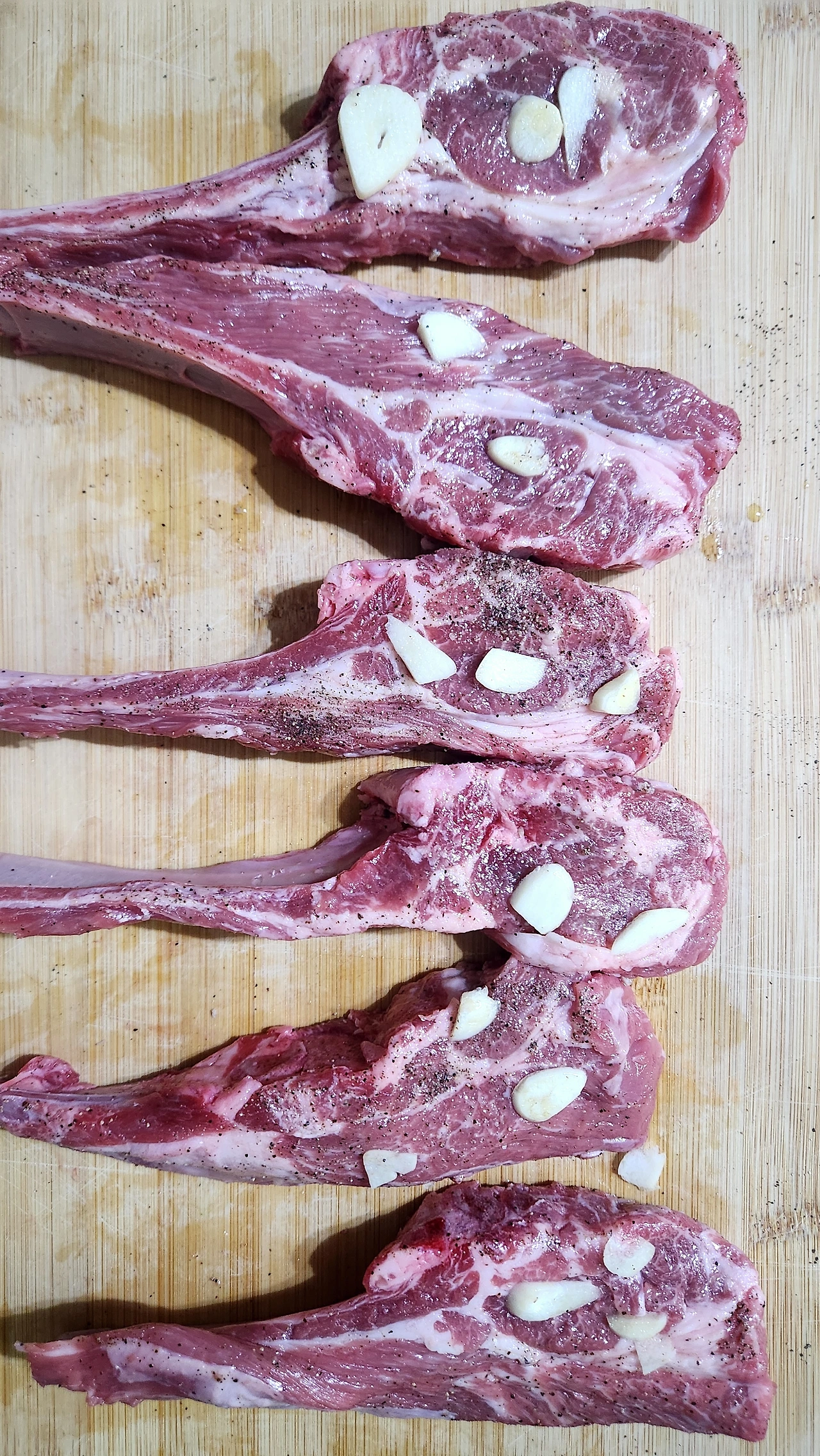 양갈비 특유의 잡내가 걱정되어 키친타월 핏기제거 후, 올리브유, 소금, 후추, 편마늘 등으로 밑간 해줬다.