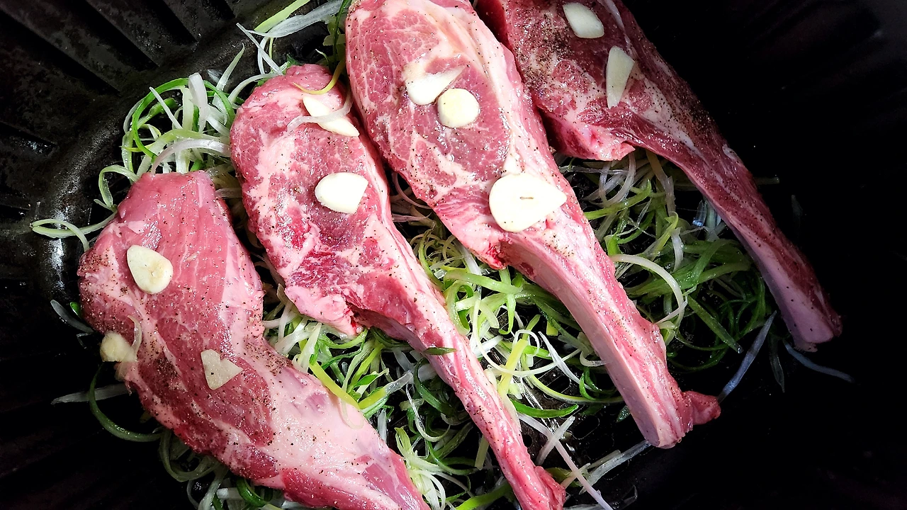 에어프라이기에선 남은 파채가 있어서 파채를 깔아주고 그 위에 양갈비를 세팅해 주었다. 앞, 뒤로 180도에서 10분간 구워주었는데... 얇은 파채가 높은 온도에서 꼬실라지듯 튀겨졌다. 양갈비에 붙은 바스락거리던 파채를 걷어내기 번거로웠으나 파향만은 물씬!