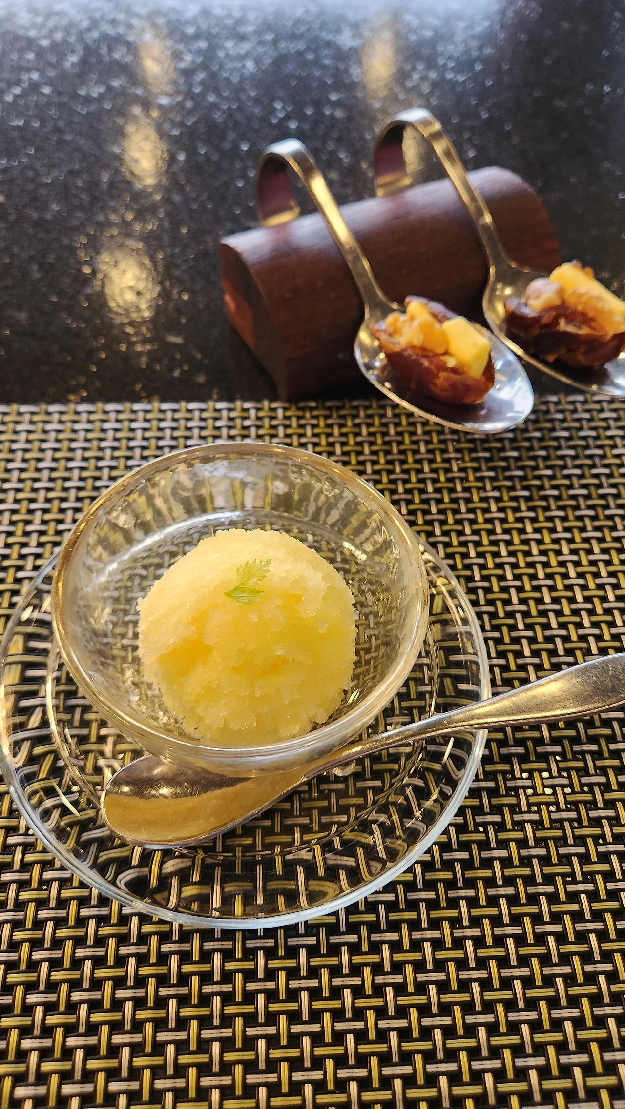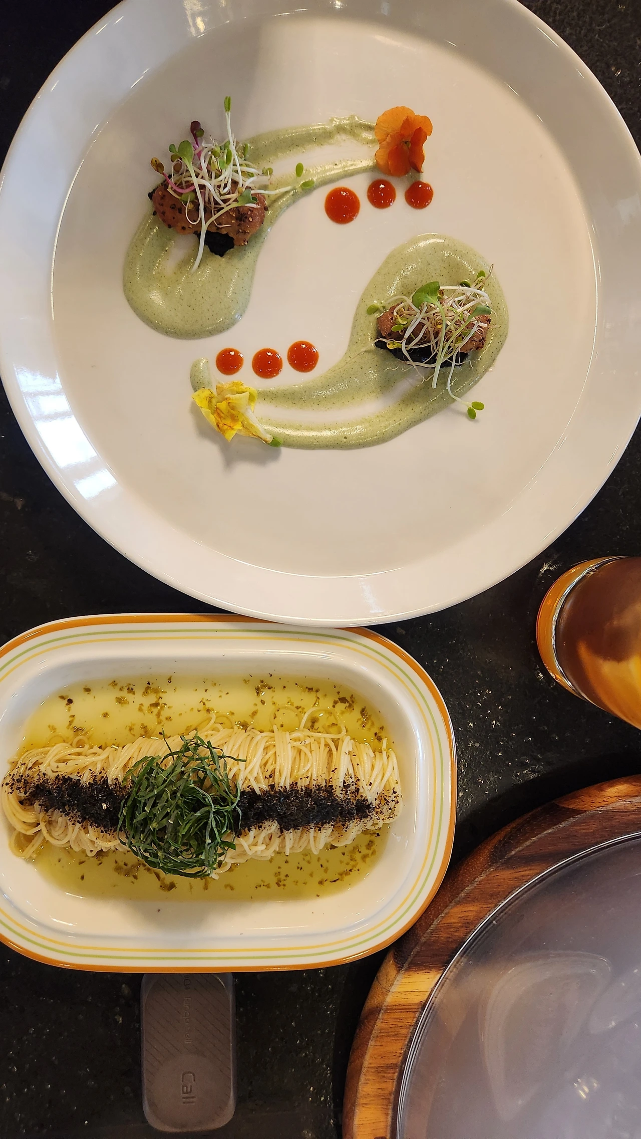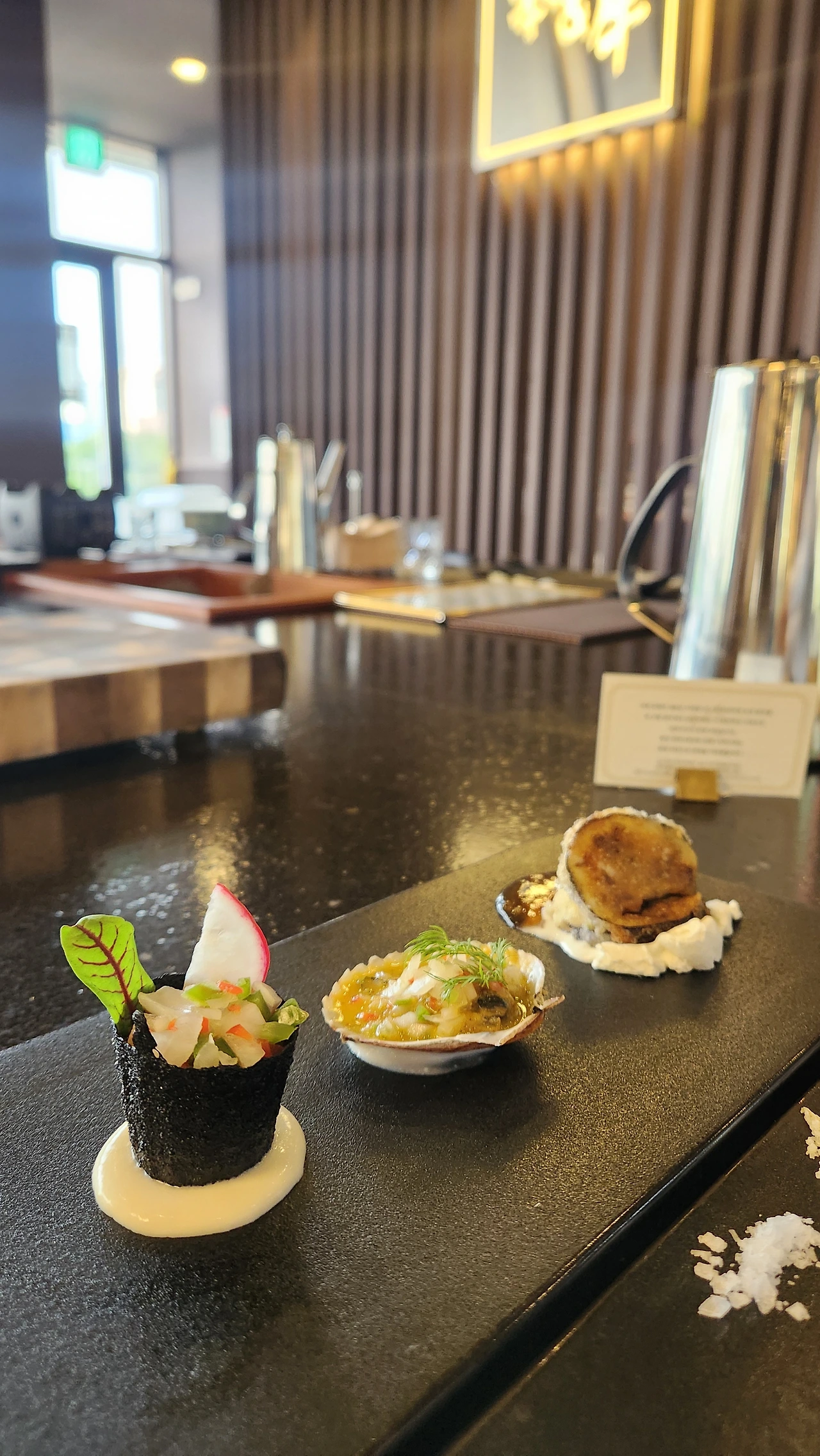 곳곳에 그림 작품들이 걸려있는 갤러리 같은 레스토랑에 도착해, 가지런히 세팅되어 있던 식기들, 이름이 적힌 웰컴 카드가 놓인 바 테이블에 앉아 음식들을 기다리는 순간부터 하나하나 다른 컨셉으로 나오는 요리들을 맞이하는 때까지... 레스토랑에서의 엄마는 평소보다 한껏 들떠 보였다. 엄마의 눈은 반짝반짝. 엄마의 고개는 연신 두리번두리번. 혼잣말과 질문이 늘었다. 생소해하면서도 그 생소함이 어색하지 않고 기분 좋은 느낌! 엄마는 엄마의 몫으로 나온 음식들 하나하나 눈으로 탐색하며 향을 음미하며 재료들을 살폈다.