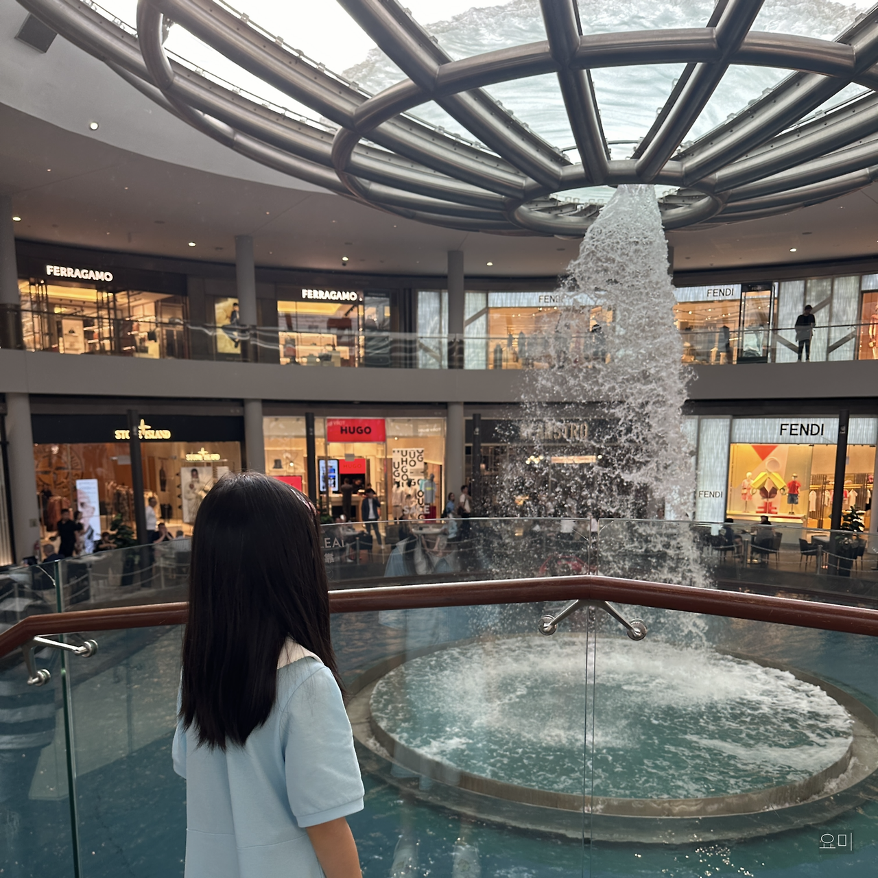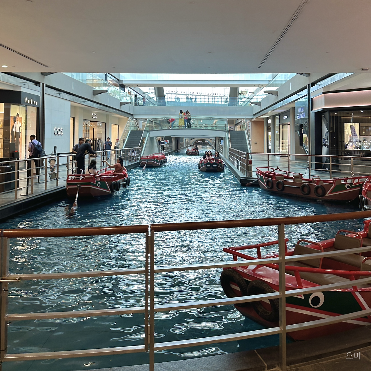 마리나베이 쇼핑몰의 첫인상은 ‘번쩍번쩍하다’였다. 온갖 럭셔리한 인테리어의 향연이었다. 바샤커피는 쇼핑몰 안쪽에 있었는데 가는 중에 중간에 보트 타는 곳이 있고, 보트 길 끝에 작은 폭포가 떨어지고 있었다. 창이 공항에서 아쉽게 못 본 폭포와는 규모나 웅장함이 비교도 안 되겠지만 여기서 본 것으로 만족하기로 했다.