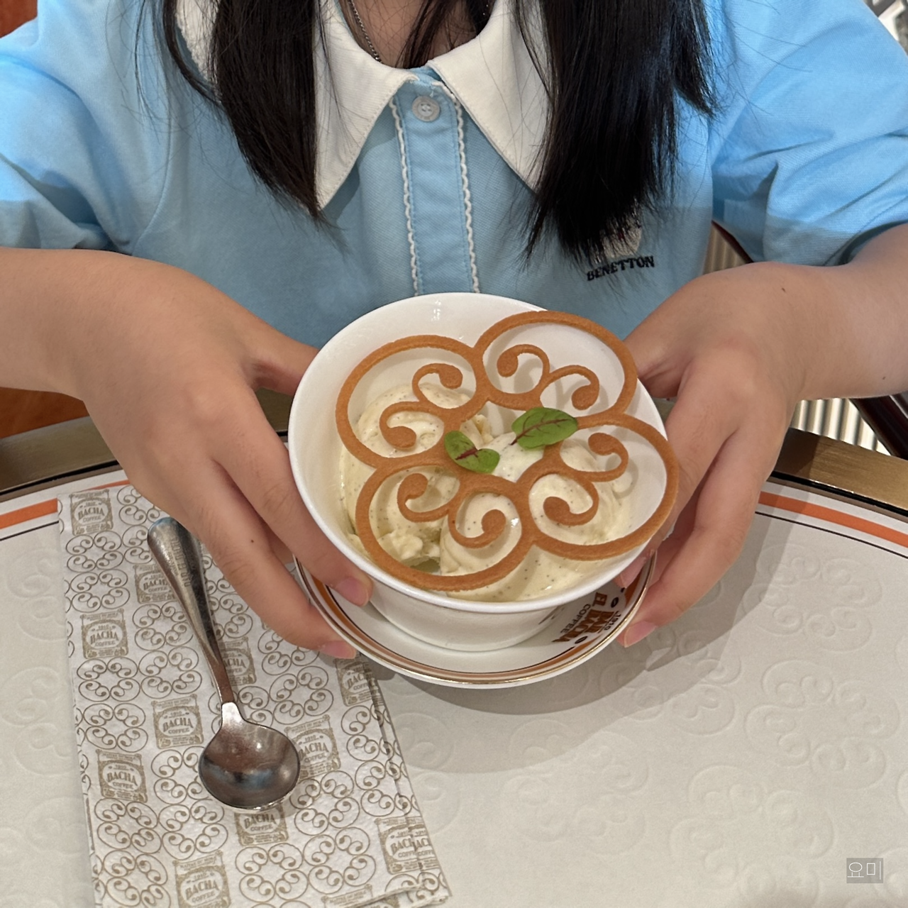 커피는 두 사람이 먹어도 충분할 정도로 주전자에 가득 담아 나오고 첫 잔은 직원이 직접 컵에 따라주었다. 커피를 받을 때는 인터넷으로 하도 많이 봐서 익숙한 느낌마저 들었는데, 아이스크림은 여기서 즉흥적으로 아이가 먹을만한 걸 찾다가 시켜서 그런지 의외로 새롭고 예뻤다.