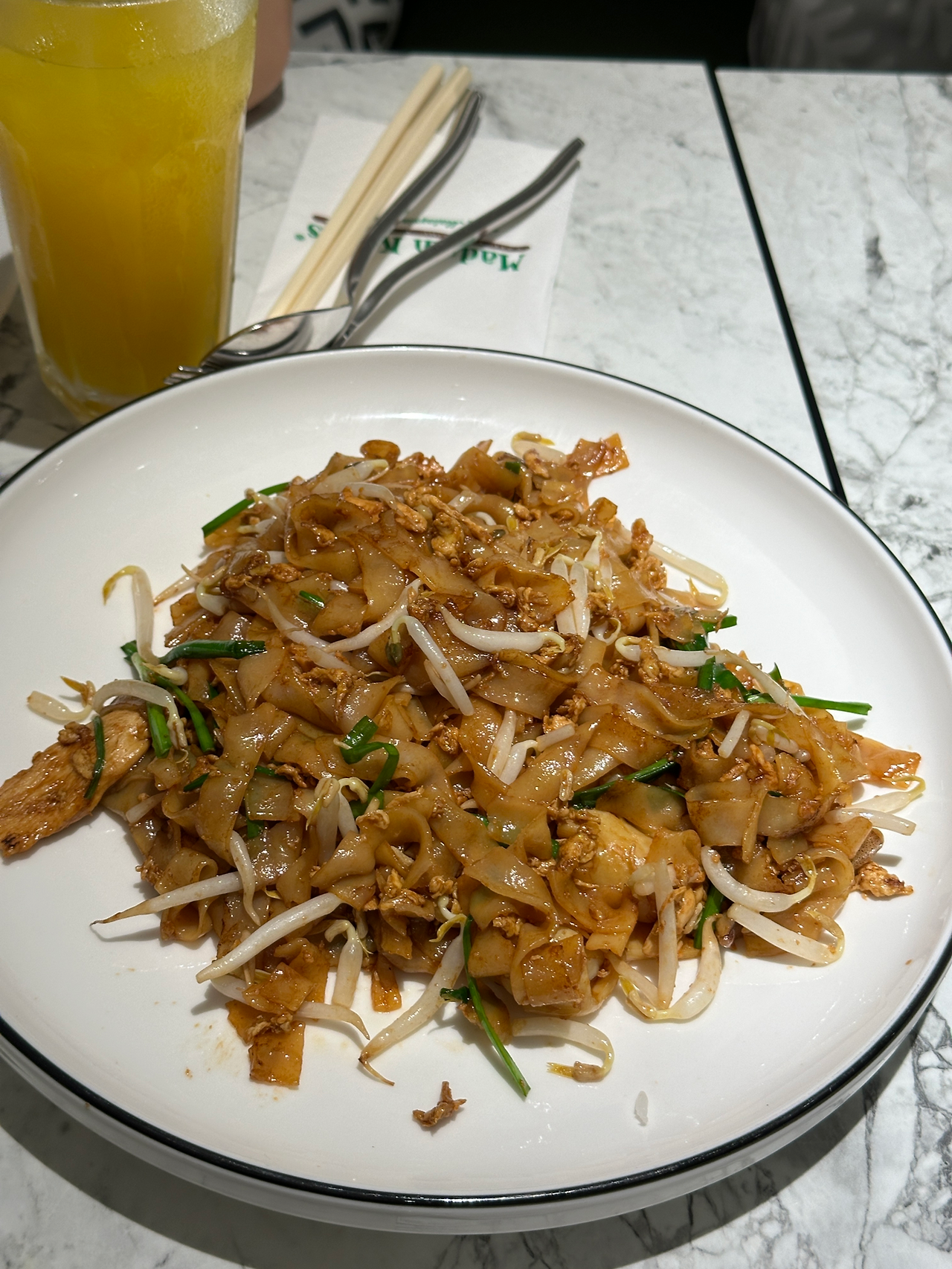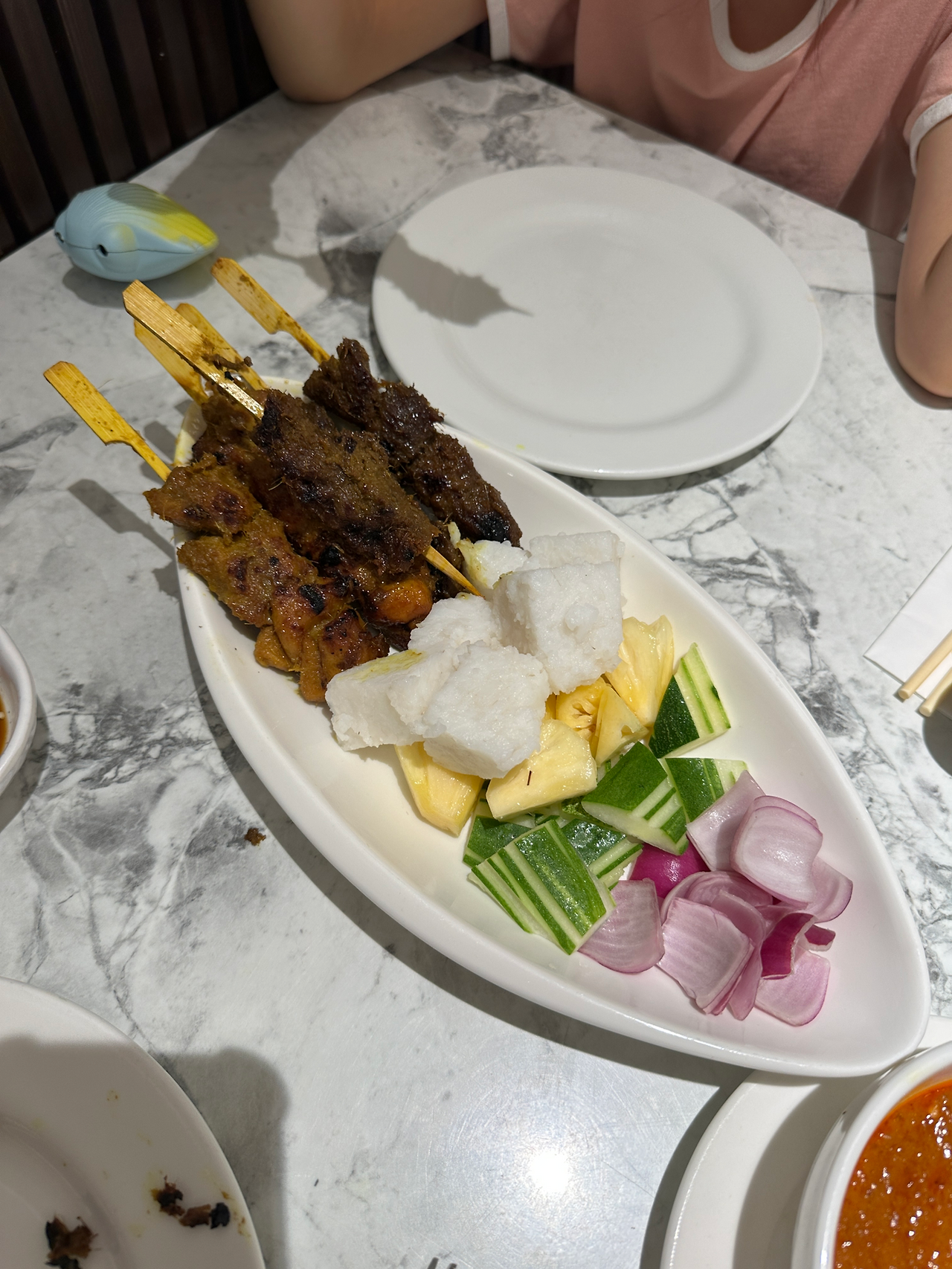 식당 정보를 검색할 때 거의 무조건 나오는 곳이 마담콴스였다. 입간판에 있는 할머니가 마담 콴 여사님인 것 같다. (말레이시아의 백종원이라 생각하면 된단다.) 나시르막부터 면요리, 빙수, 커피까지 거의 모든 음식이 다 있고 qr코드로 주문을 받는다. 우린 싱가포르에서 못 먹었던 사테와 내가 좋아하는 팟타이를 주문했다. 사테는 돼지고기와 닭고기 두 가지가 나왔는데, 닭고기는 치킨에 카레가루를 섞은 맛, 돼지고기는 갈비 양념에 카레가루를 섞은 듯한 맛이 났다. 전부 우리가 알고 있는 맛이라서, 또 우린 배고픈 상황이었기에 맛있게 먹었다. 팟타이와 음료까지 먹어보니, 전체적으로 향신료가 덜 세서 아이도 먹기 좋았다.