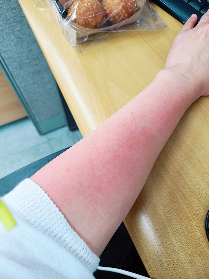 그제 햇살 속을 걷고 팔이 익었습니다. 너무 피곤해서 씻고 그냥 잠들었는데 일어나 보니 양팔이 바깥쪽만 빨갛게 달아올라있더라구요. 씻을 때 따갑다고 생각하긴 했는데 그냥 해를 쐰지 얼마 되지 않아 그렇겠지 하고 쉽게 생각했던게 화근이었나 봅니다.