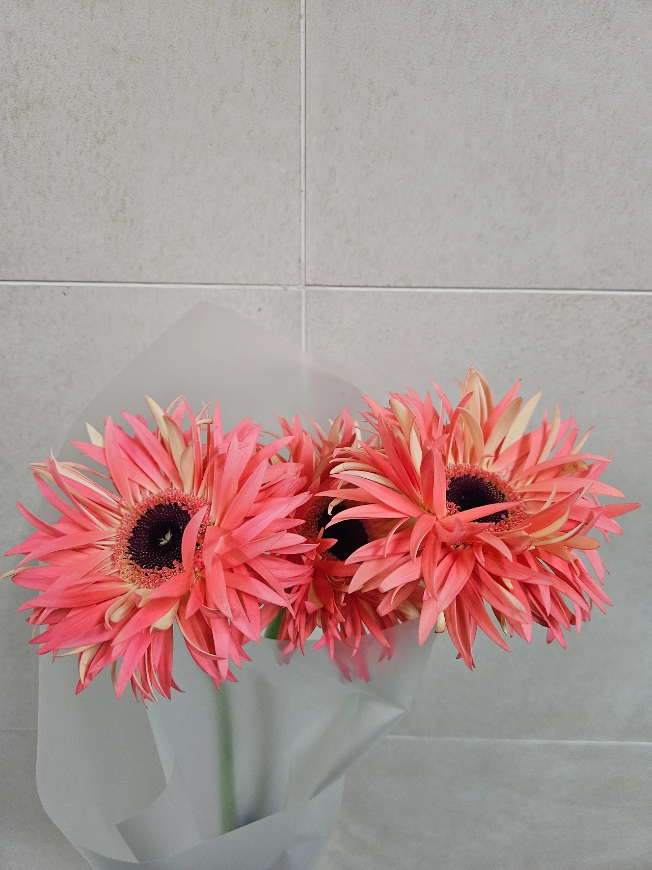 스파이더 거베라. 색도 모양도 자연스럽지 않다. 자연스럽지 않아서 예쁘다. 취향을 인정하지 않을 수 없다. 나는 송이가 크고 화려한 꽃을 좋아한다. 수수하고 슴슴한 꽃들도 어여쁘지만 곁에 두고 오래 마음을 기대기에는 너무 정갈하다. 카스텔라 두 조각과 커피 한 잔으로 점심을 때우는 대신 꽃을 산다면 제대로 사치스럽게. 생활과 동떨어진 마음으로.