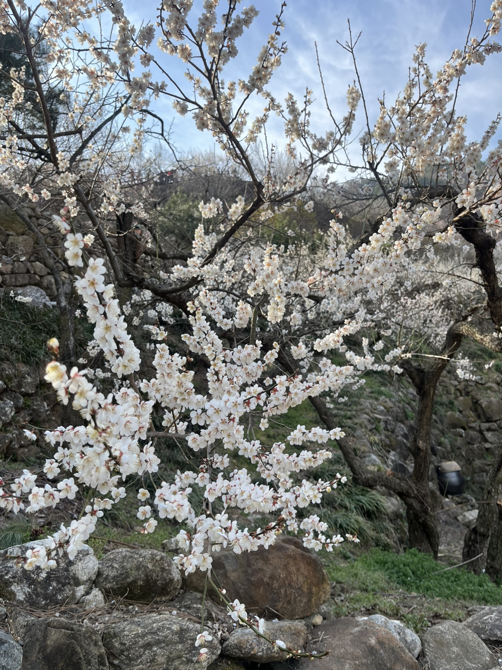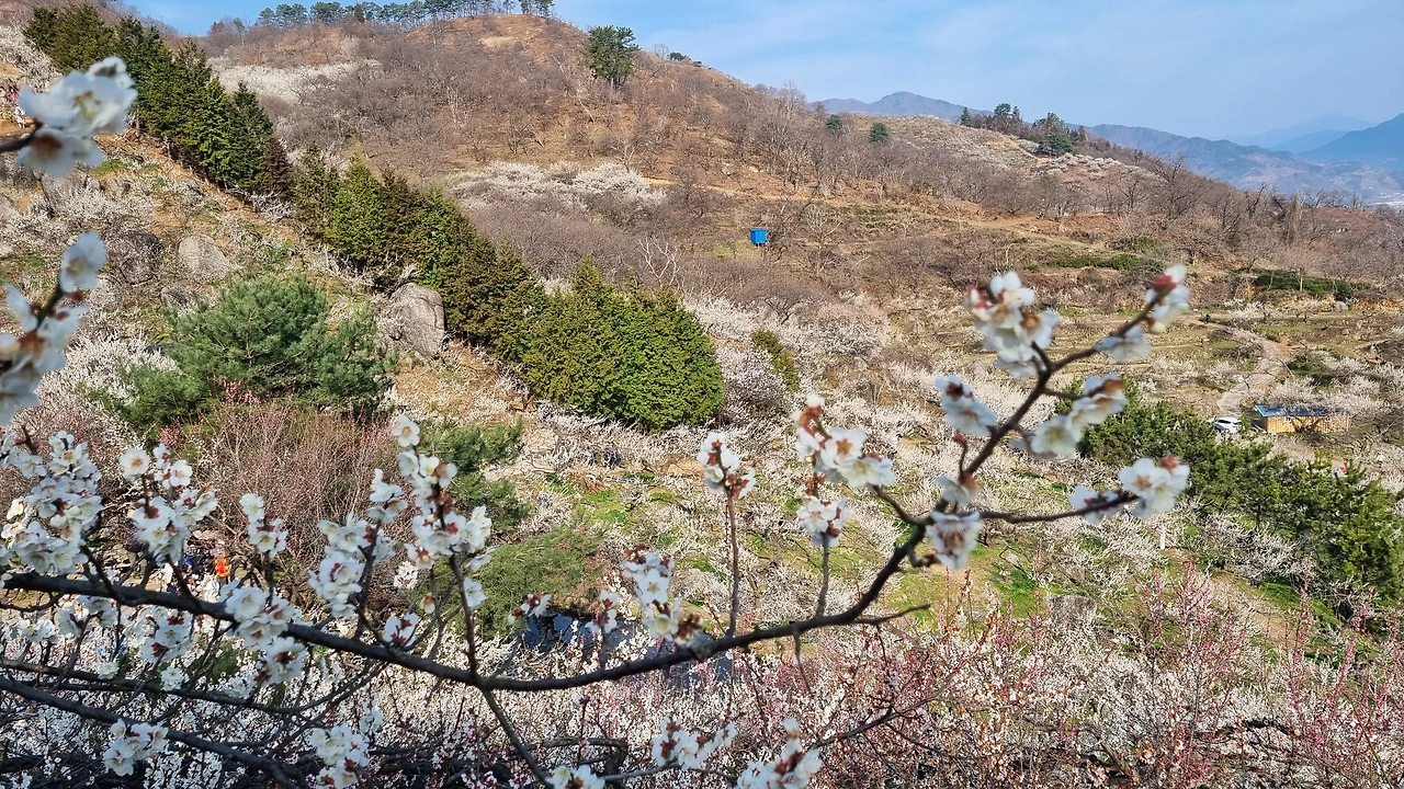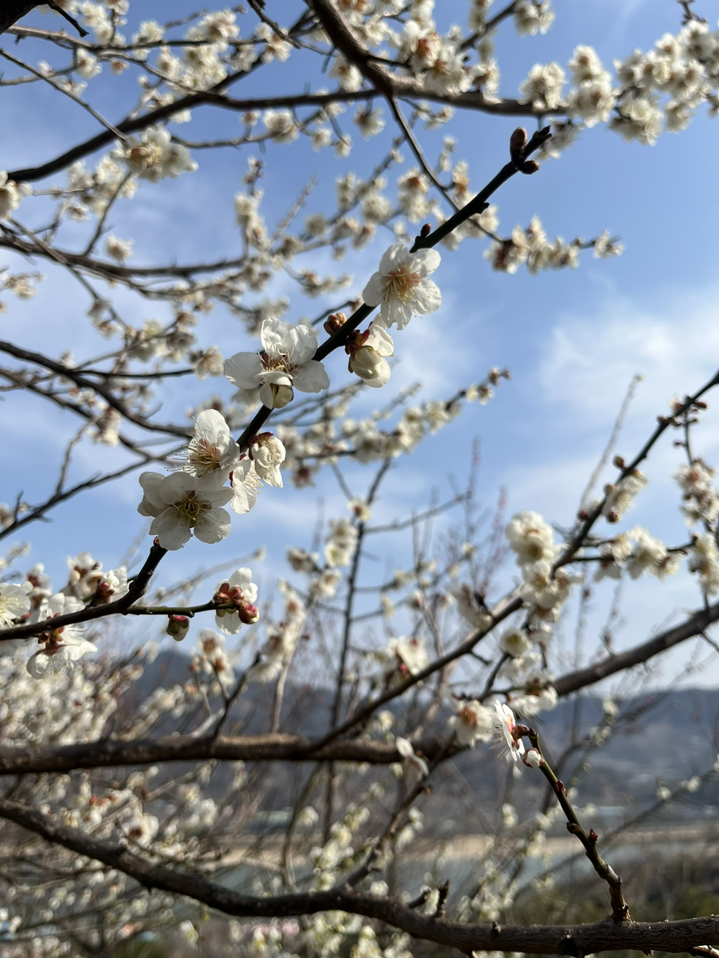 노란 마을에서 하룻밤을 묵고 조금 더 남쪽으로 내려가 매화도 만났어요. 그곳은 훨씬 사람들이 많아서 온전히 꽃송이들에 집중하기는 어려웠습니다. 하지만 희고 작은 매화의 꽃잎들도 산수유만큼 연하고 부드럽고 아름다웠어요. 멀리서 바라보면 역시나 무수한 흰색의 점들로 보입니다.