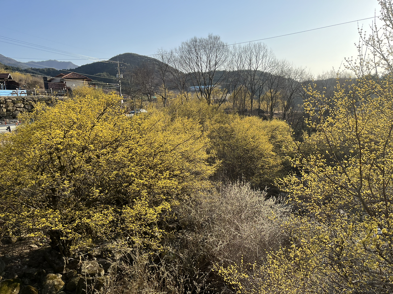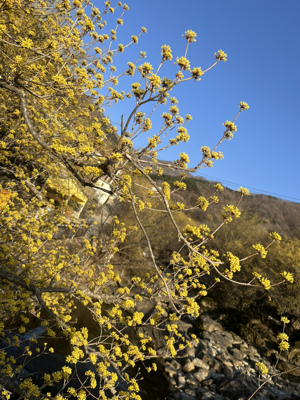 구례의 어느 마을로 들어서니 노란빛이 보이기 시작합니다. 마을로 깊이 가면 갈수록 노랑이 점점 많아집니다. 산수유꽃축제예요. 산수유는 노란빛의 안개꽃 같네요. 자잘한 점들이 모여 완성되는 그림 같아요. 나이가 아주 많을 법한 거대한 산수유나무, 노란 꽃송이가 만들어 주는 그늘을 한참 걸었습니다. 졸졸 개울물 소리가 막 꽃망울 터뜨리는 산수유와 잘 어울리더군요.