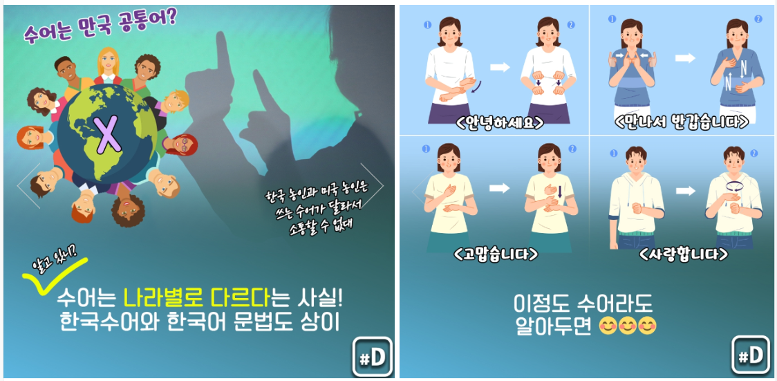 아쉬운 것은 주변에서 농인을 만나기 쉽지 않다는 점이다. 나의 경우 수어를 배우면서 올봄에 인생 처음으로 농인을 만났다. 남편에게 물으니 역시 실제로 농인을 만난 경험이 없다고 한다. 딸은 기차에서 수어를 하는 농인들을 몇 번 본 적이 있다 하고.