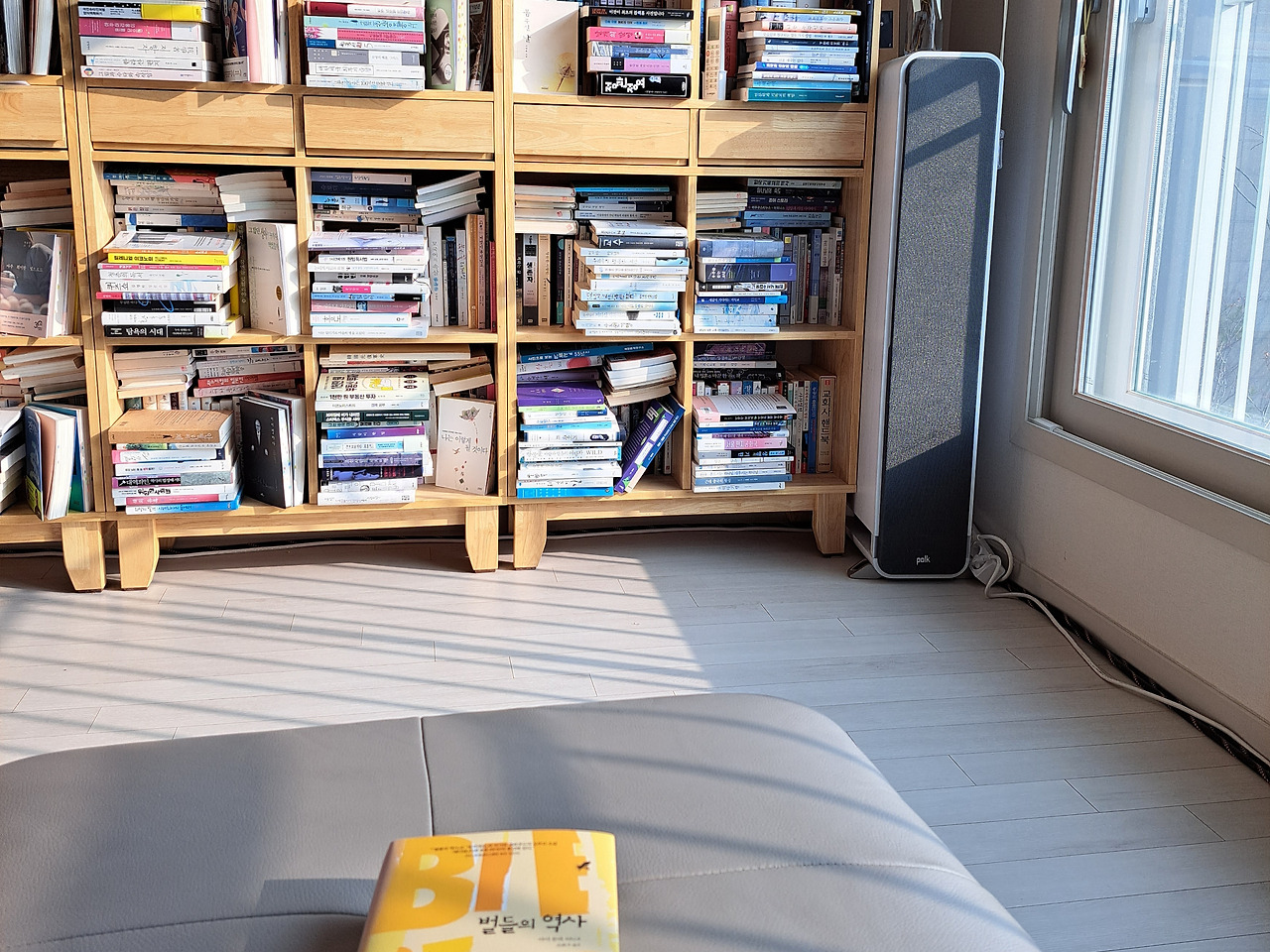 일단 거실 창문 블라인드를 위로 바짝 올려 바깥 세상을, 소음이 차단된 세상을 유리창으로 먼저 조우한다. 이 시간이면 햇살이 떠오를 시간 같은데 태양은 어디에도 보이지 않는다. 아침에 동쪽에서 해가 떠오르면 거실에 내가 앉은 쇼파에서부터 햇살이 나타나 오후가 되면서 거실 건너편 책장쪽으로 이동한다. 겨울인 요즘에도 오후 다섯 시경까지 햇살이 있다. 그러다보니 거실은 난방을 하지 않아도 내부 온도가 26도까지 오르기도 한다.