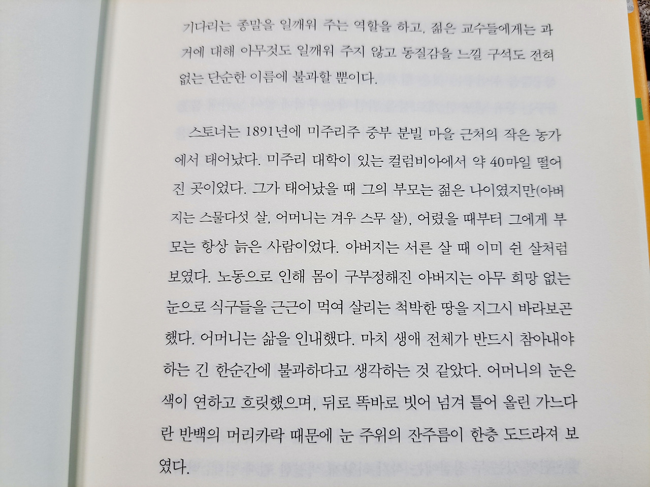 그런데 오늘 스토너를 다시 읽으면서, 아버지를 떠올리게 되었다. 아버지에게 자신의 한 평생 삶은 어떤 모습이었을까. 아들인 나는 어떤 자녀였을까. 그분의 삶은 언제 행복했을까.