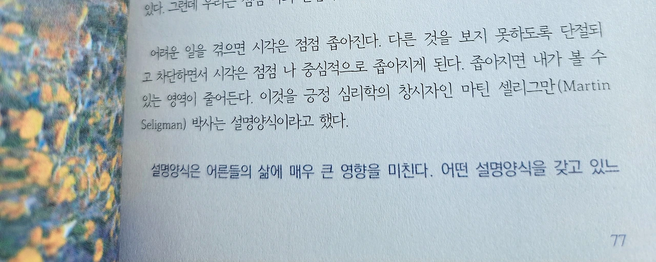 "설명양식은 어른들의 삶에 매우 큰 영향을 미친다. 어떤 설명양식을 갖고 있느냐에 따라 날마다 겪는 사소한 실패 때문에 우울증이 생길수도 있고, 비극적인 상황을 건강하게 이겨낼 수도 있다.