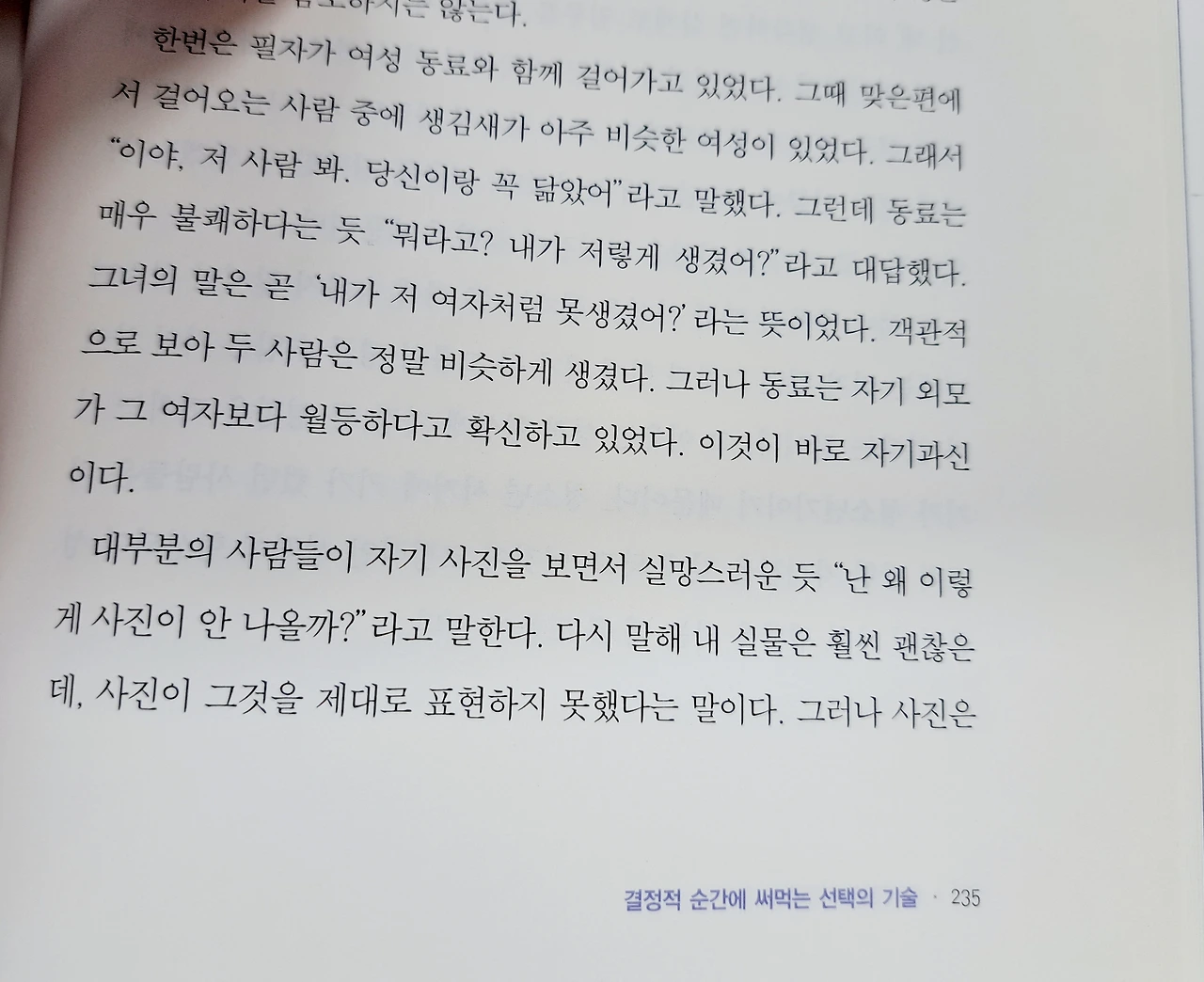 나도 마찬가지다. 나는 내가 꽤 괜찮은 사람이라고 생각하고 있다. 나는 얼굴도 잘 생겼다고 생각하고 있다. 공부도 잘하는 학생이었고, 늘 우등생이었다고 기억하고 있다. 그리고 남들이 어떻게 평가했는지는 모르겠지만 회사에 들어와서도 늘 기대 이상의 성과를 올렸다고 스스로 판단해왔다. 그러니까 나는 스스로 생각해도 참 뛰어난 사람인 것이다.
