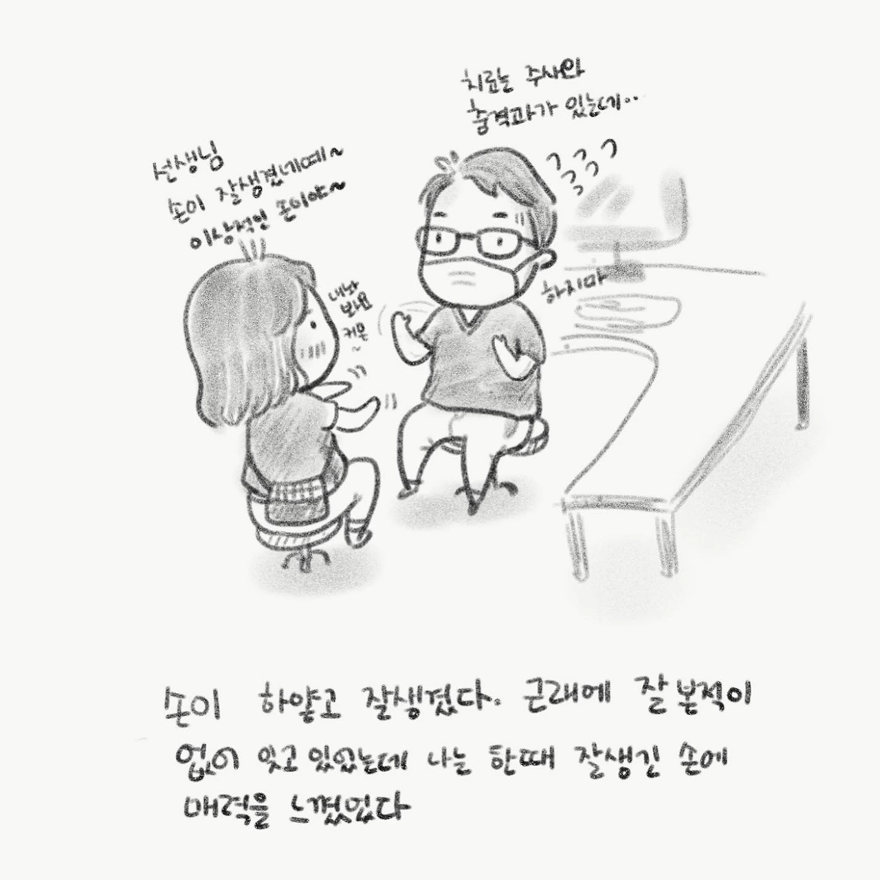 얼마 전 손가락을 다쳐 고생을 했던 친구에게 병원을 추천받아 간 병원에서 인생 의사 선생님을 만났다. 그 원장 선생님은 내 얘기를 자세히 듣고 내가 말하지 않은 것들도 자세히 묻고 설명을 해주었다. 말을 할 때마다 내 불편에 공감하듯 마스크 위로 보이는 눈이 커졌다 작아졌다 한다. 젓가락질이 힘들었다는 얘기에는 윗눈썹이 팔자로 변하기도 했다. 관성을 벗어난 의사 선생님의 이런 류의 친절 같은 건 드라마에서나 있는 줄 알았다. 처음 있는 반응에