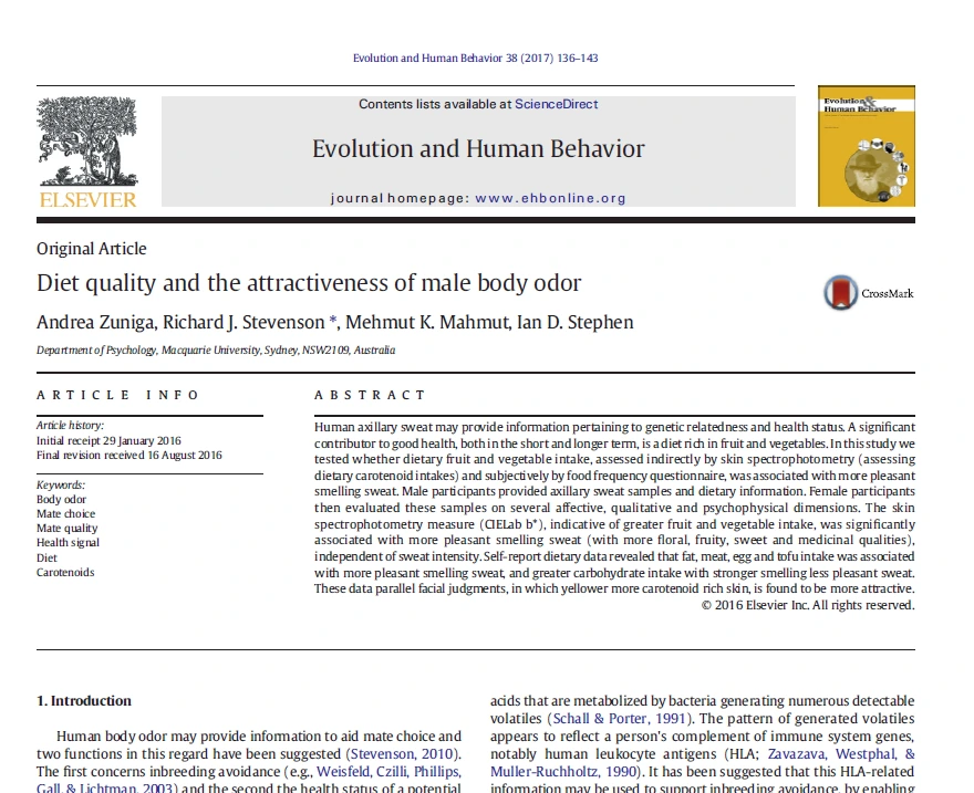 Zuniga, A., Stevenson, R. J., Mahmut, M. K., & Stephen, I. D. (2017). Diet quality and the attractiveness of male body odor. Evolution and Human Behavior, 38(1), 136-143.