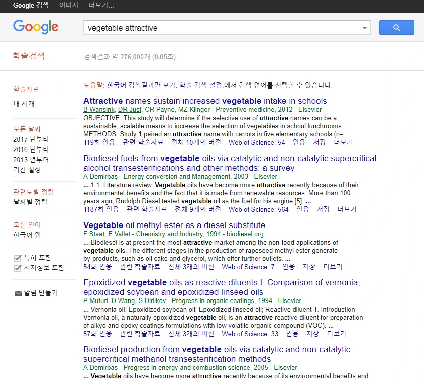 출처가 없다. 해당 연구 논문을 찾기 위해 어디서부터 탐색 작업을 시작해야 할지 난감했다. 우선 기사 본문을 다시 읽으면서 단서가 될 만한 정보들을 찾았다. '채소', '호감', '호주 메쿼리대학교', '이아 스테판' 등의 단어가 눈에 띄었다. 일단 의외로 쉽게 찾을 수도 있으므로, 무작정 관련 단어를 논문 검색 사이트에 쳐 보기로 했다. 구글 학술검색(http://scholar.google.com)에 들어가서 'vegetable attract', 'vegetable attractiveness' 'vegetable attractive', 'vegetable sweat' 등등 생각나는 대로 검색을 해 봤다. 그런데 안타깝게도 내가 찾는 논문은 보이지 않았다. 아무래도 내 검색 능력이 많이 모자란 것 같기도 하다.