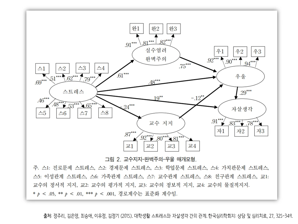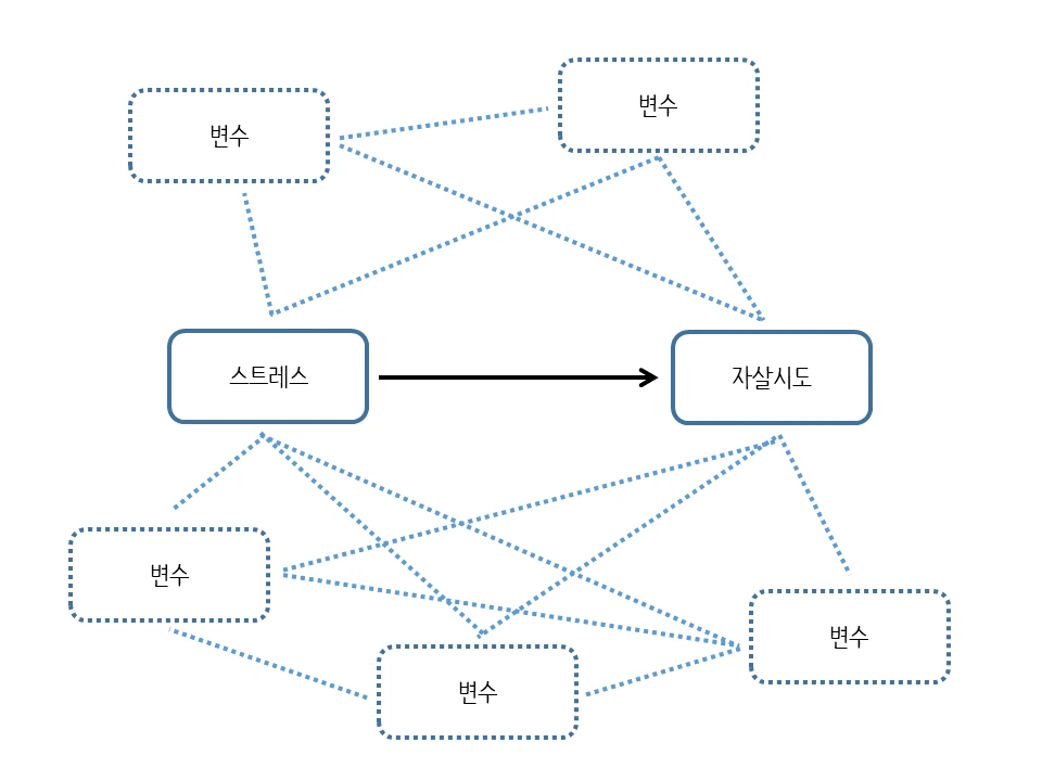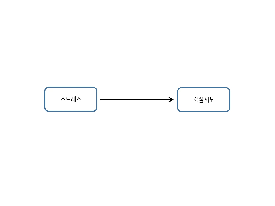 이 당연하고, 뻔한 연구가 완성된 후에야 우리는 스트레스와 자살시도 간 관계에 대한 보다 복잡한 연구에 돌입할 수 있다. 두 변인 각각에, 혹은 두 변인 간 관계성에 영향을 미칠 것으로 기대되는 추가 변수들을 상정하고, 마찬가지로 엄격한 과학적 연구 방법론에 입각한 검증 과정을 통해 보다 정밀하게 이해의 폭을 넓혀갈 수 있다. 스트레스와 자살시도 간의 관계성이 과학적으로 검증되었다면, 이제 다음과 같은 추가 질문들을 던져볼 수 있다. 스트레스가 '직접적으로' 자살시도에 영향을 미치는가? 아니면 다른 변수들을 통해 '간접적으로' 영향을 미치는가? 그밖에 스트레스, 자살시도에 영향을 미치는 변수들을 과연 무엇인가? 해당 추가 변수들 간에는 또 어떤 관계가 있는가?