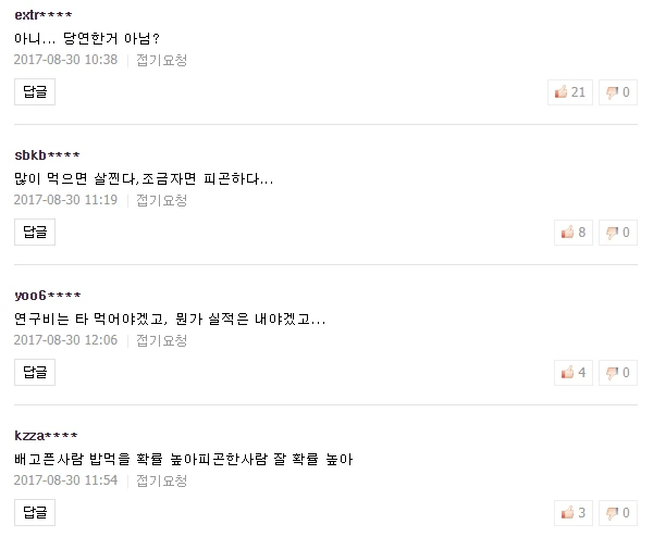오늘 소개해드리고 싶은 심리학 연구 관련 기사는 다음과 같다. "스트레스 많은 여성 '자살 시도' 확률 높다". 성별에 따라 자살 시도와 연관되는 변수가 상이할 수 있다는 사실을 지적한 연구로, 남성은 암 발병 경험이, 여성은 스트레스 수준이 자살 시도 확률과 더 큰 관련을 보였다는 것이 핵심 내용이다. 여성의 스트레스와 자살 시도 간의 관계를 조금 더 자세히 살펴보자면, 스트레스를 크게 경험하는 여성이 그렇지 않은 여성에 비해 약 3.6배 높은 자살 시도 확률을 보였다. 그렇다면 이 연구 결과에 대해 누리꾼들은 어떤 반응을 내어 놓았을까? 다음의 댓글들을 한번 살펴보도록 하자.